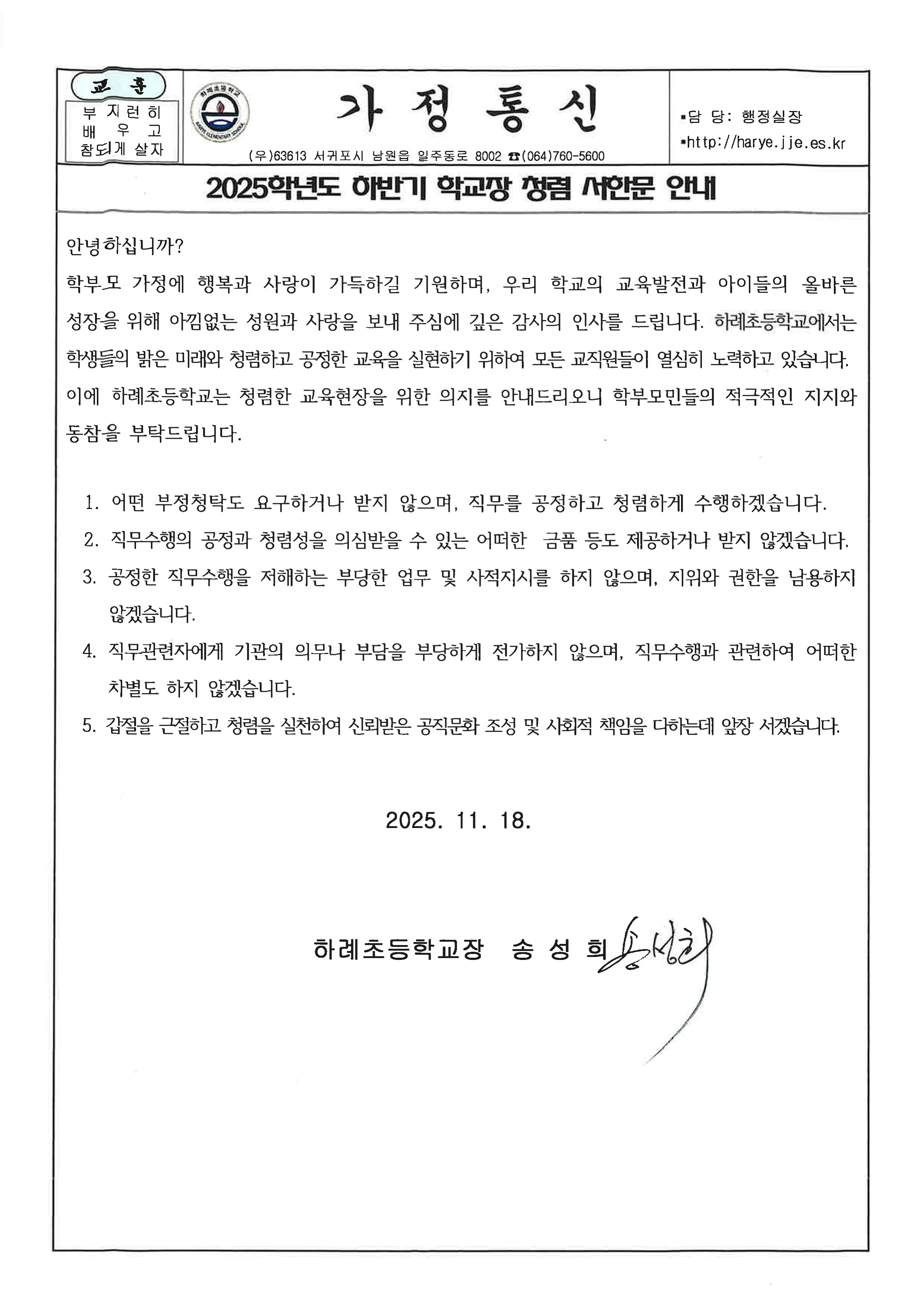 2025학년도 하반기 하례초등학교 학교장 청렴서한문은 붙임과 같습니다.