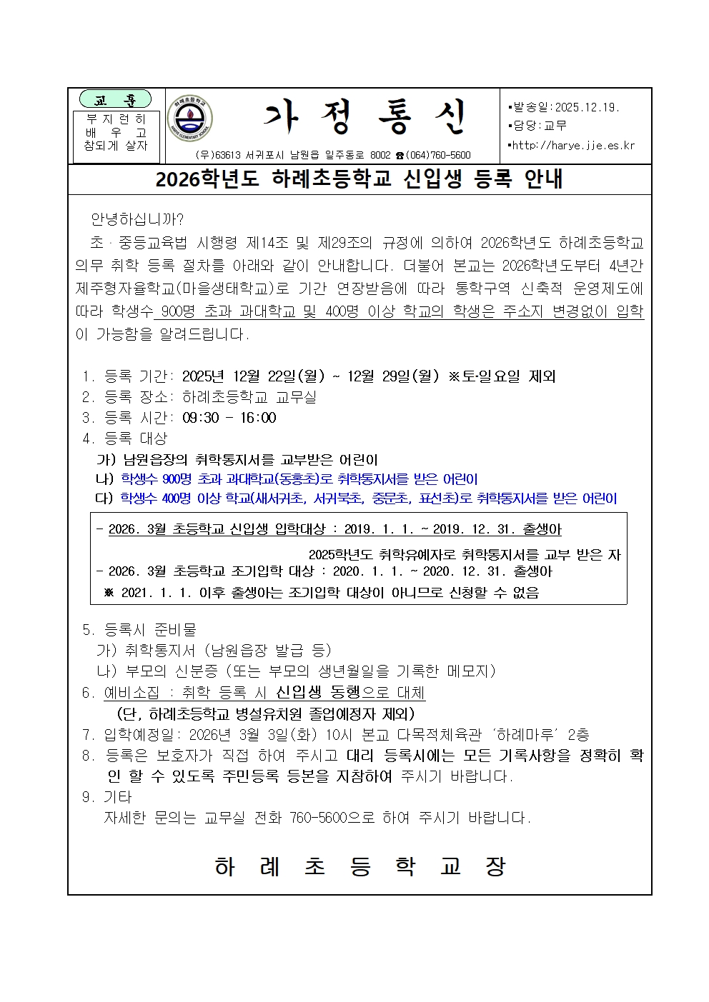 2026학년도 신입생 취학등록 안내