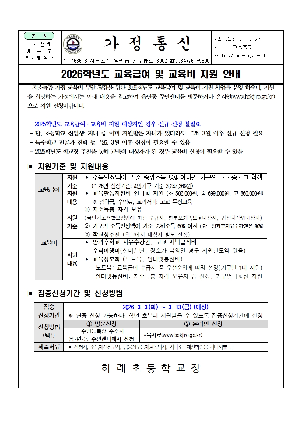 2026학년도 교육급여 및 교육비 지원 안내