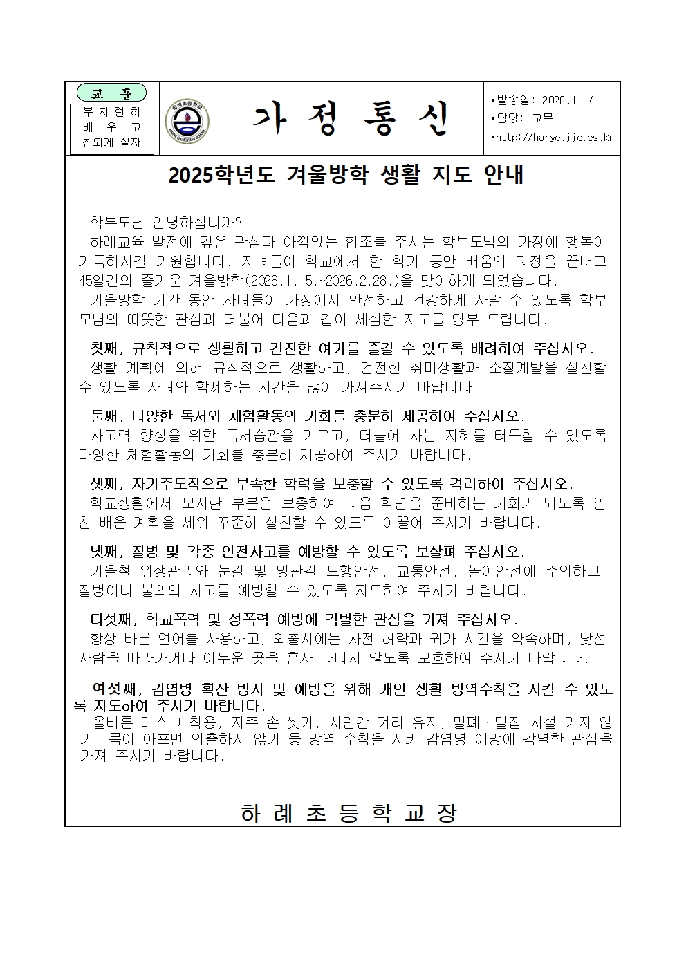 2025학년도 겨울방학 생활지도 안내(가정통신문)