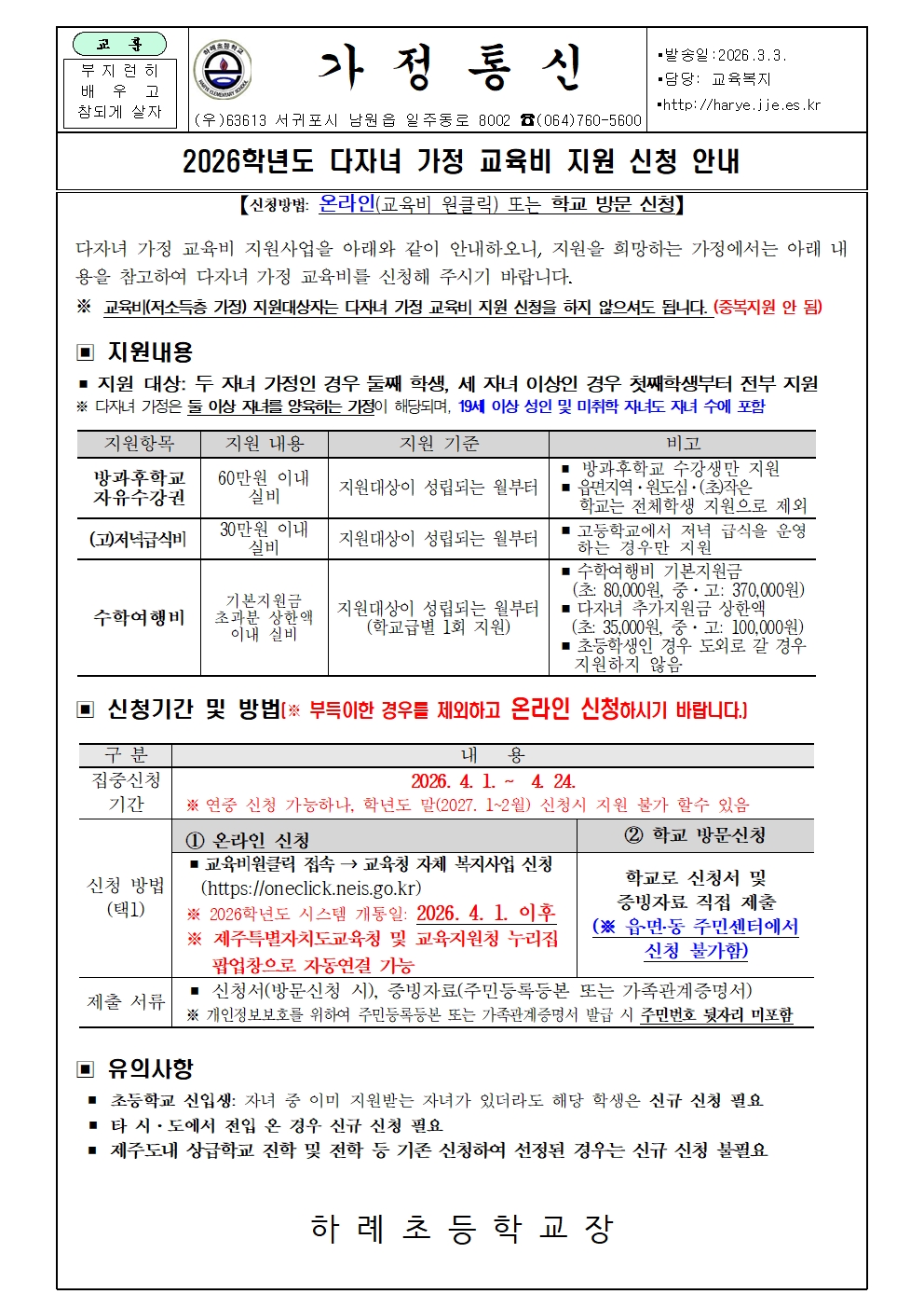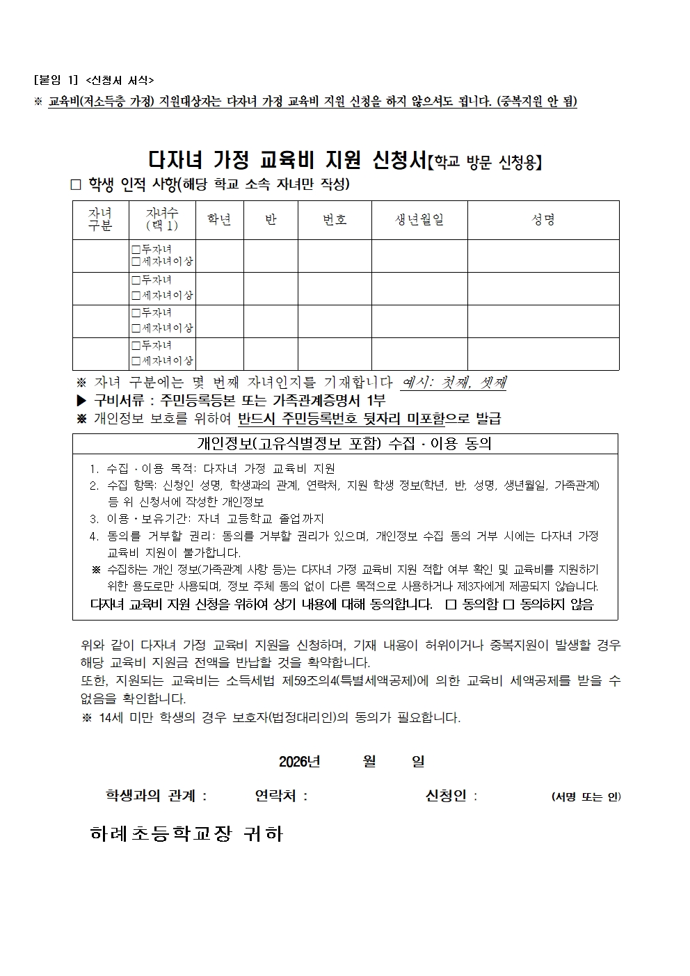 2026학년도 다자녀 가정 교육비 지원 신청 안내