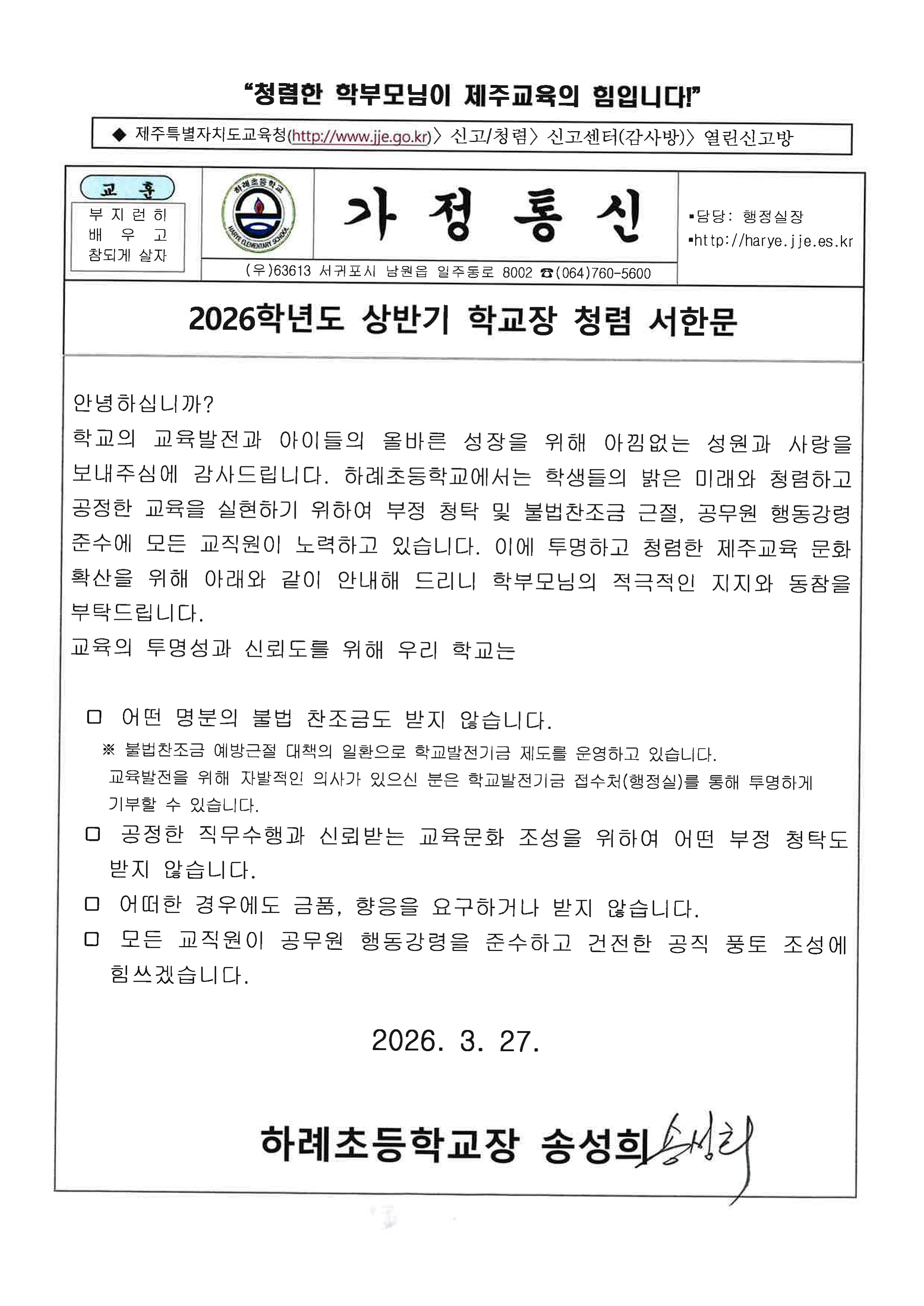 2026학년도 상반기(3월) 학교장 청렴 서한문