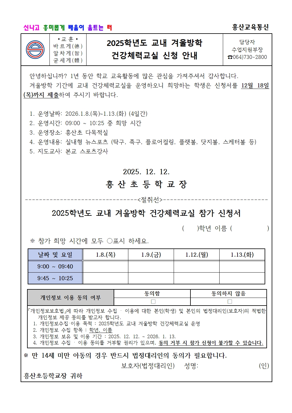 2025학년도 교내 겨울방학 건강체력교실 신청 안내