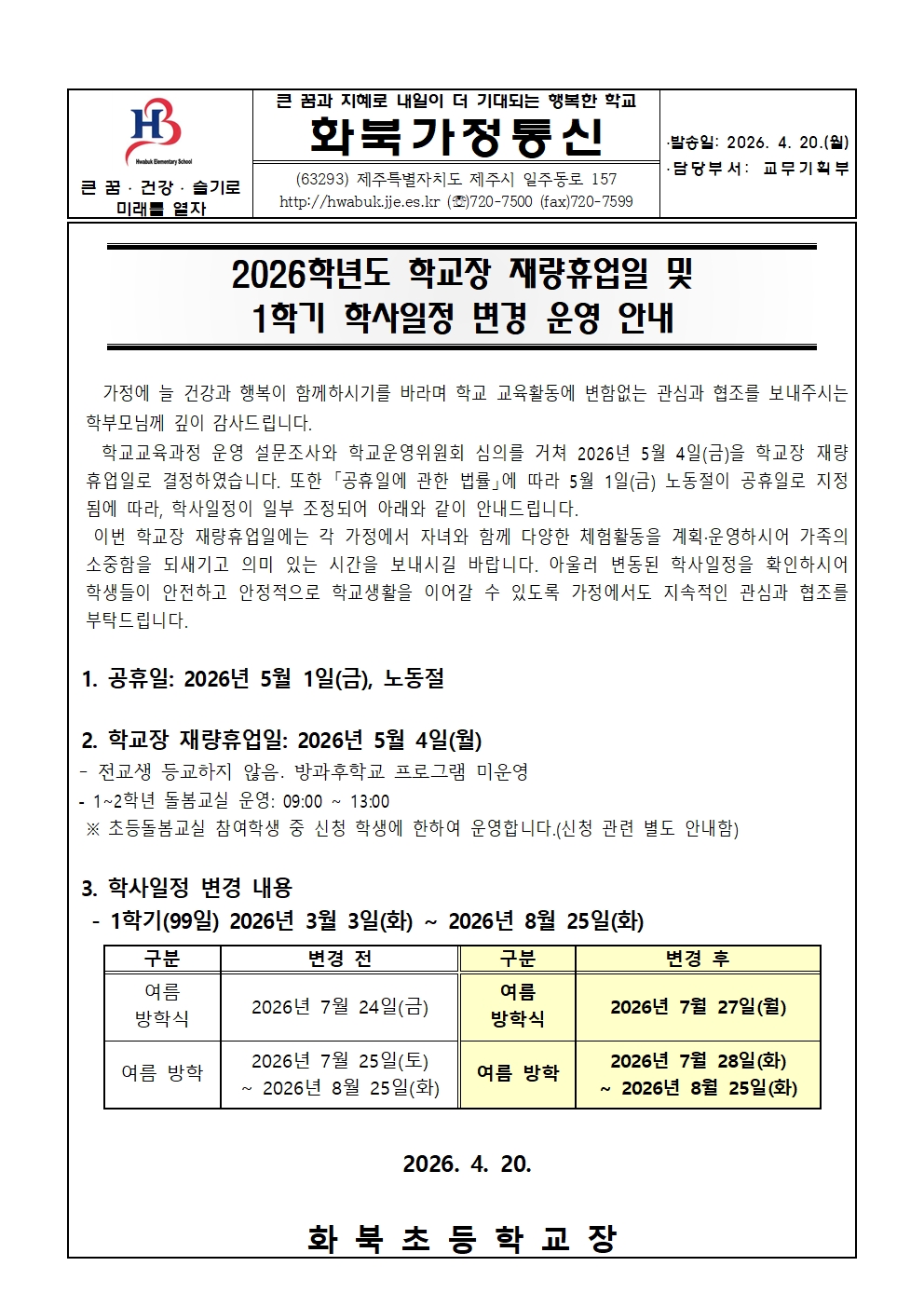 2026학년도 학교장 재량휴업일(5.4) 및 1학기 학사일정 변경(여름방학식 7월 27일) 운영 안내