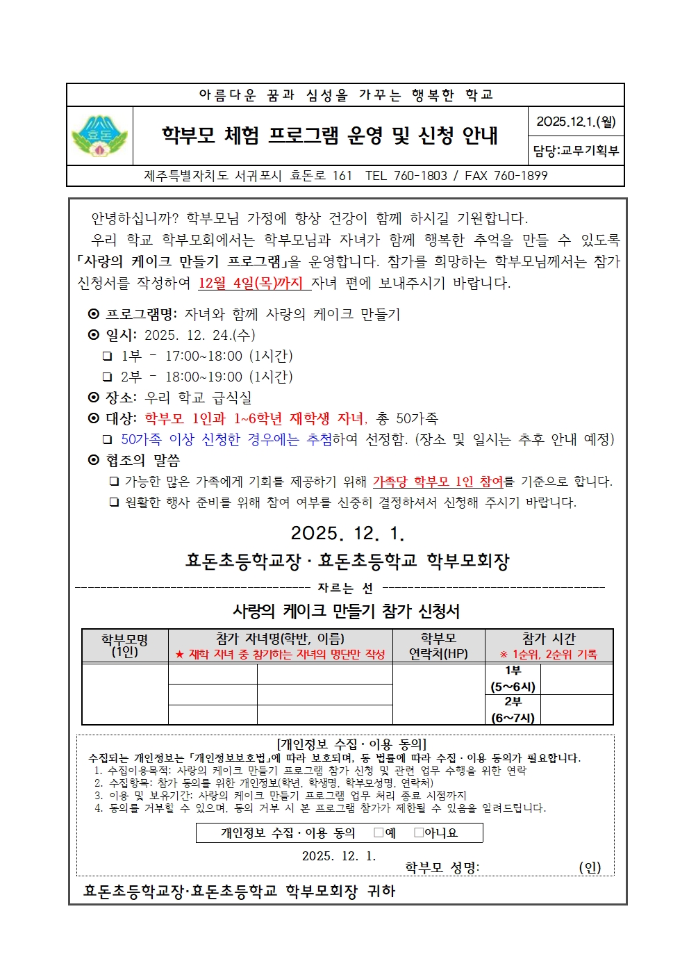 학부모 체험 프로그램(사랑의 케이크 만들기) 운영 및 신청 안내