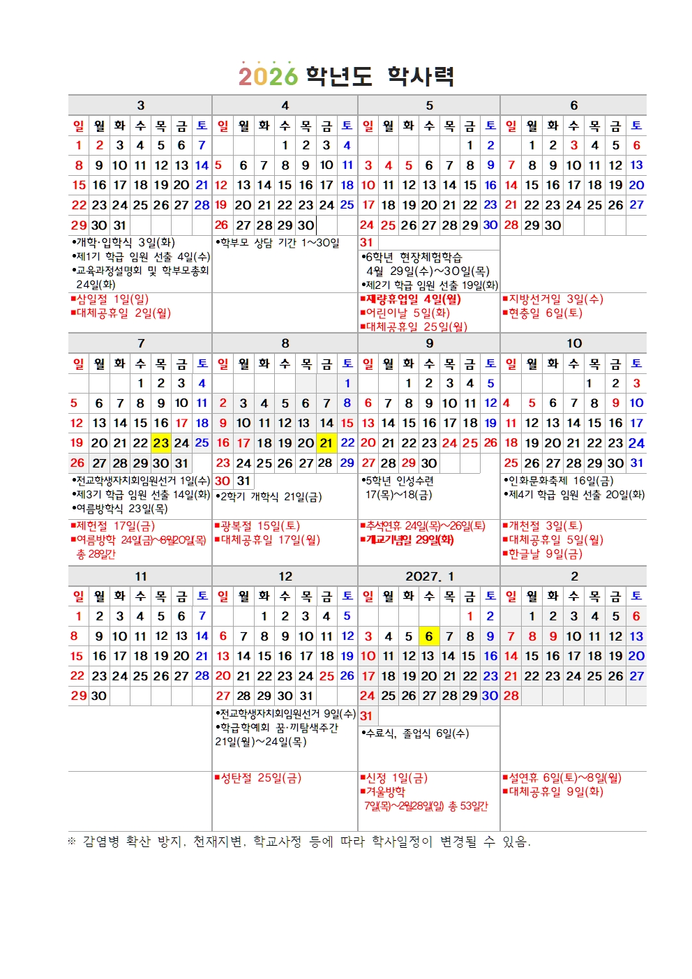 2026학년도 학사력