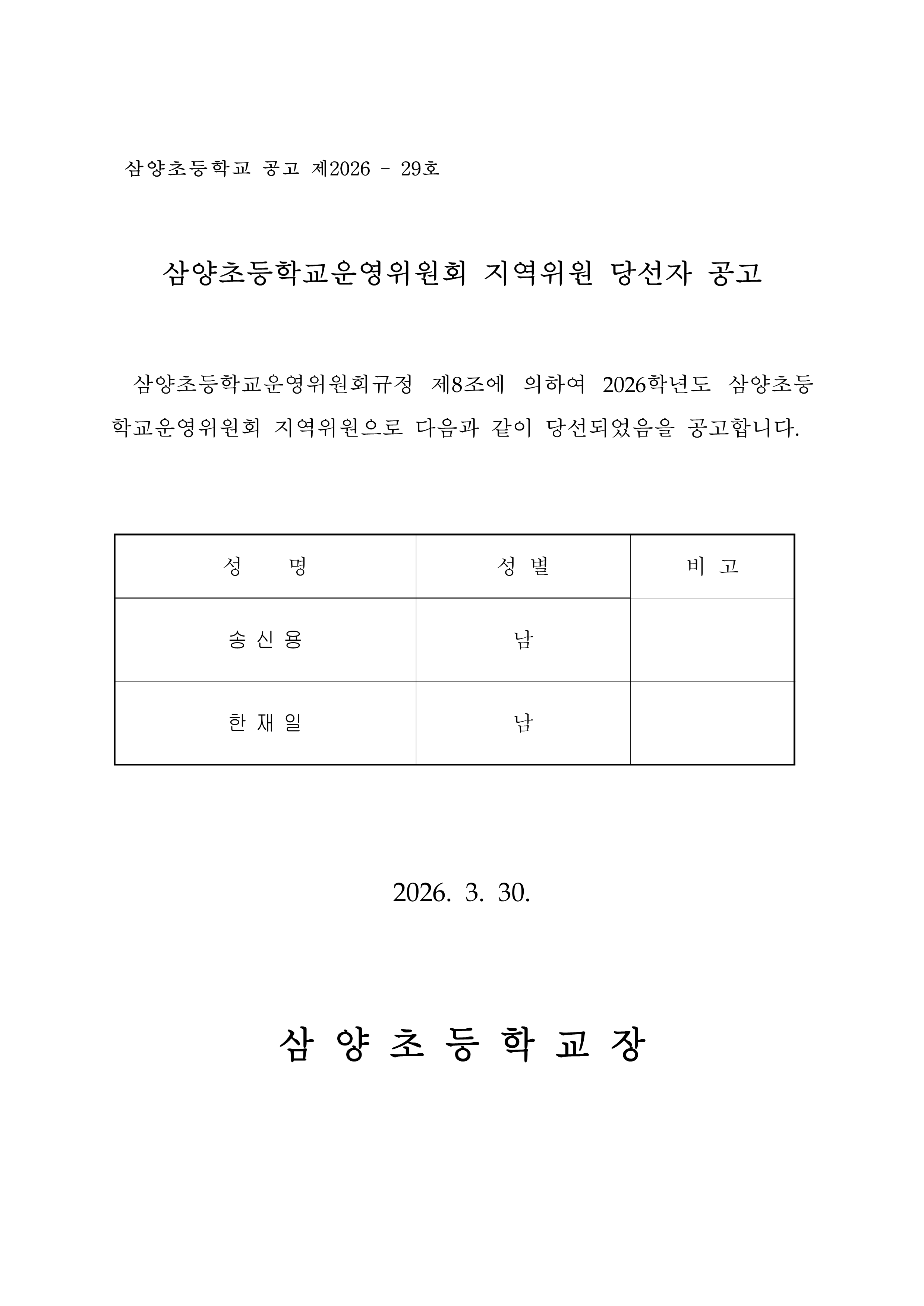 2026학년도 삼양초등학교운영위원회 지역위원 당선자 공고