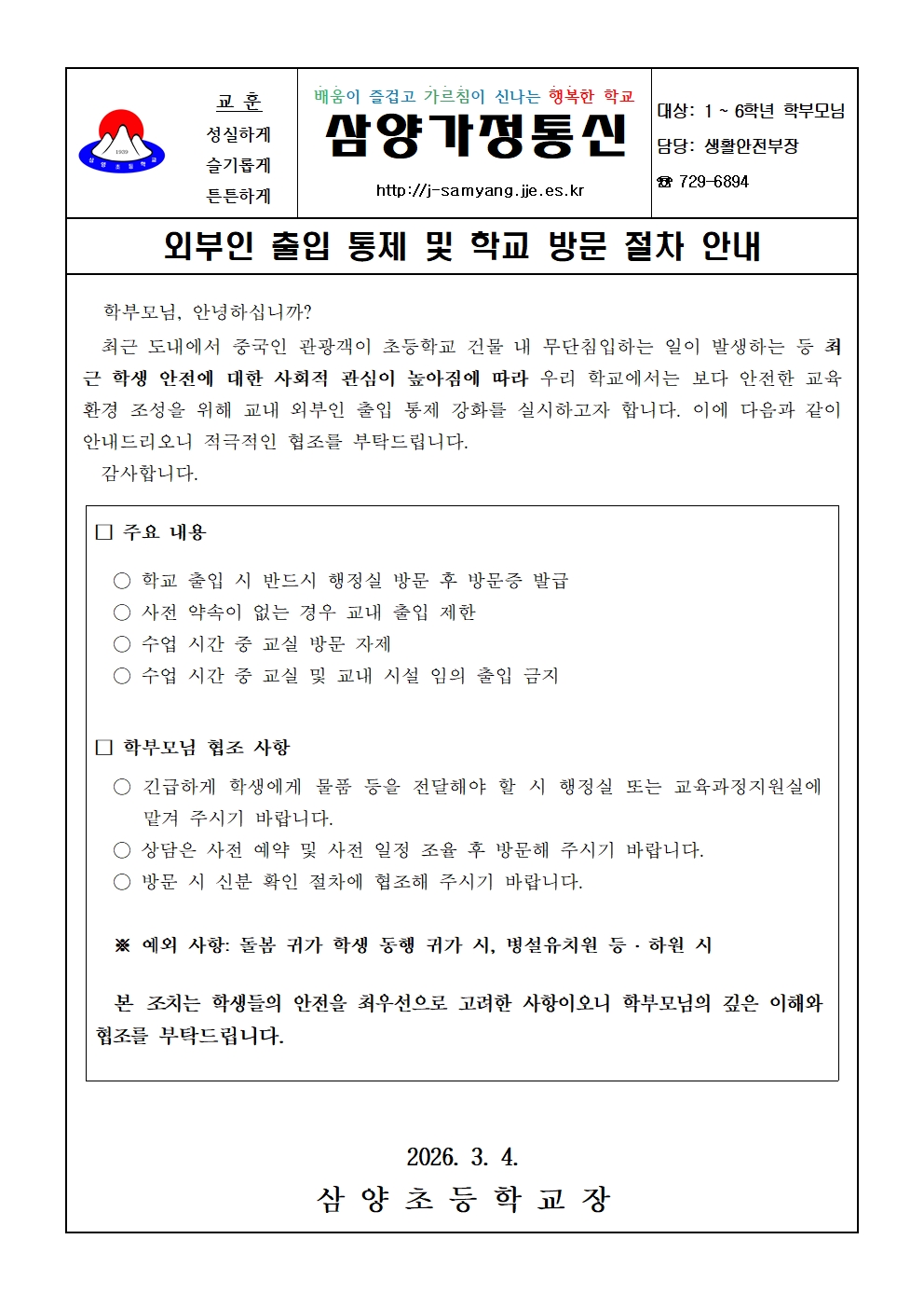 (가정통신문) 외부인 출입 통제 및 학교 방문 절차 안내