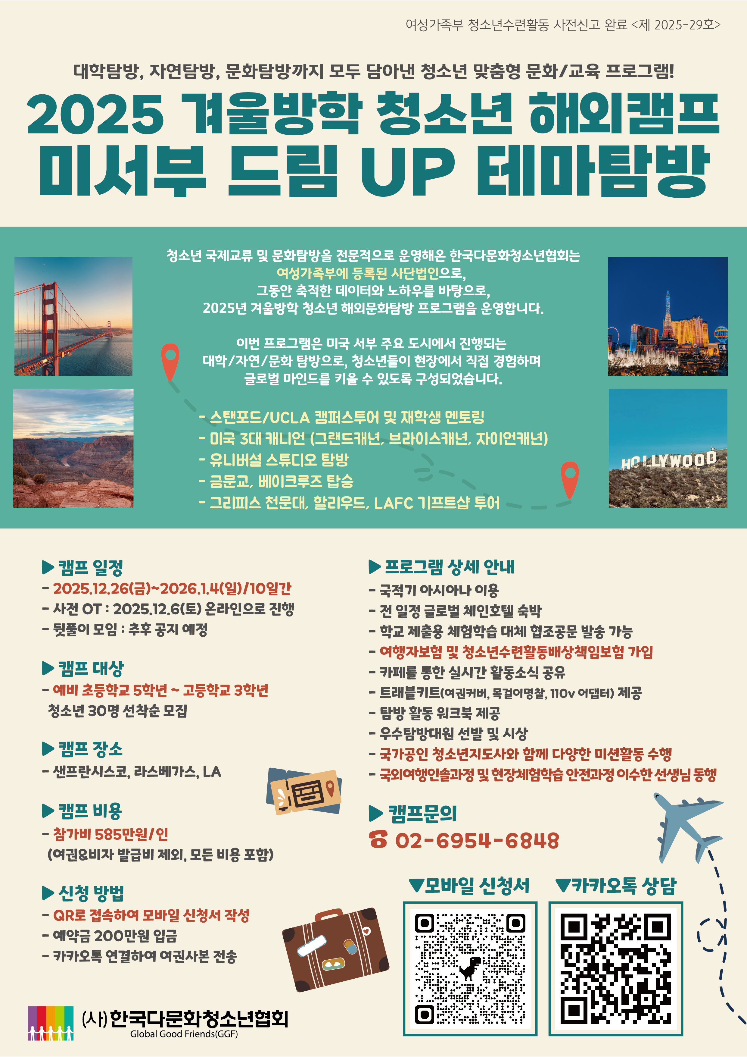 2025년 겨울방학 청소년 해외문화탐방 - 미서부 드림UP 테마탐방 참가자 모집 안내