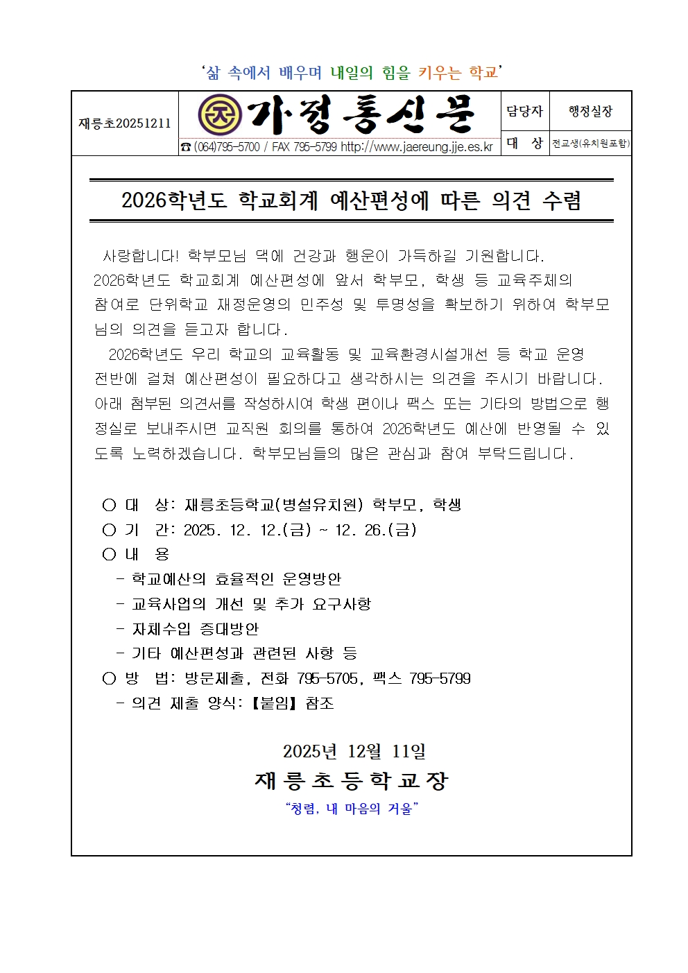 2026학년도 학교회계 예산편성에 따른 의견 수렴(가정통신문)