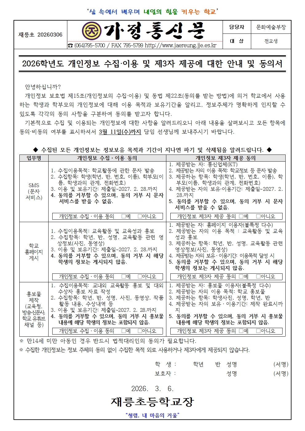 2026학년도 개인정보 수집·이용 및 제3자 제공에 대한 안내 및 동의서 가정통신문