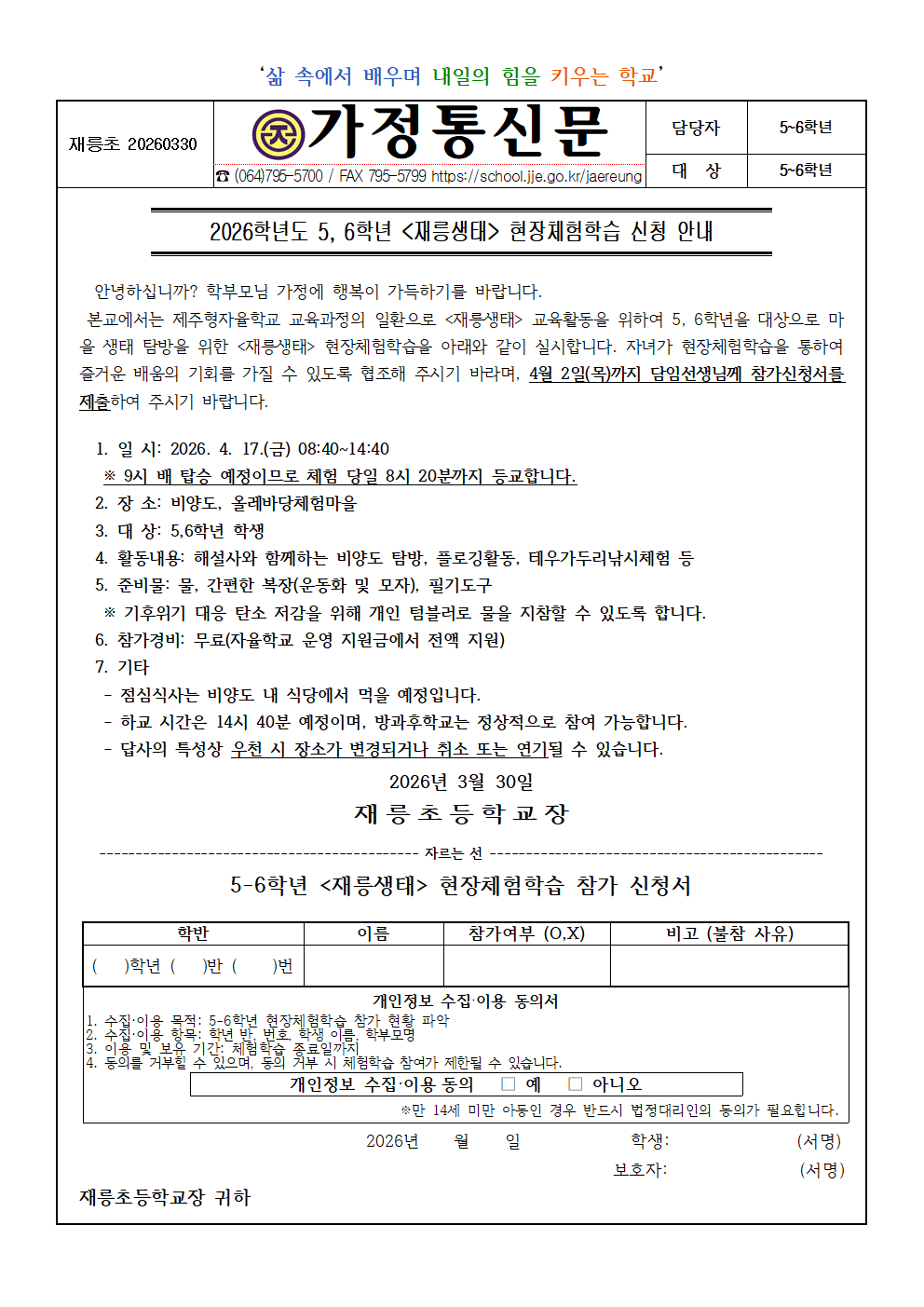 2026학년도 5,6학년 [재릉생태] 현장체험학습 운영 가정통신문
