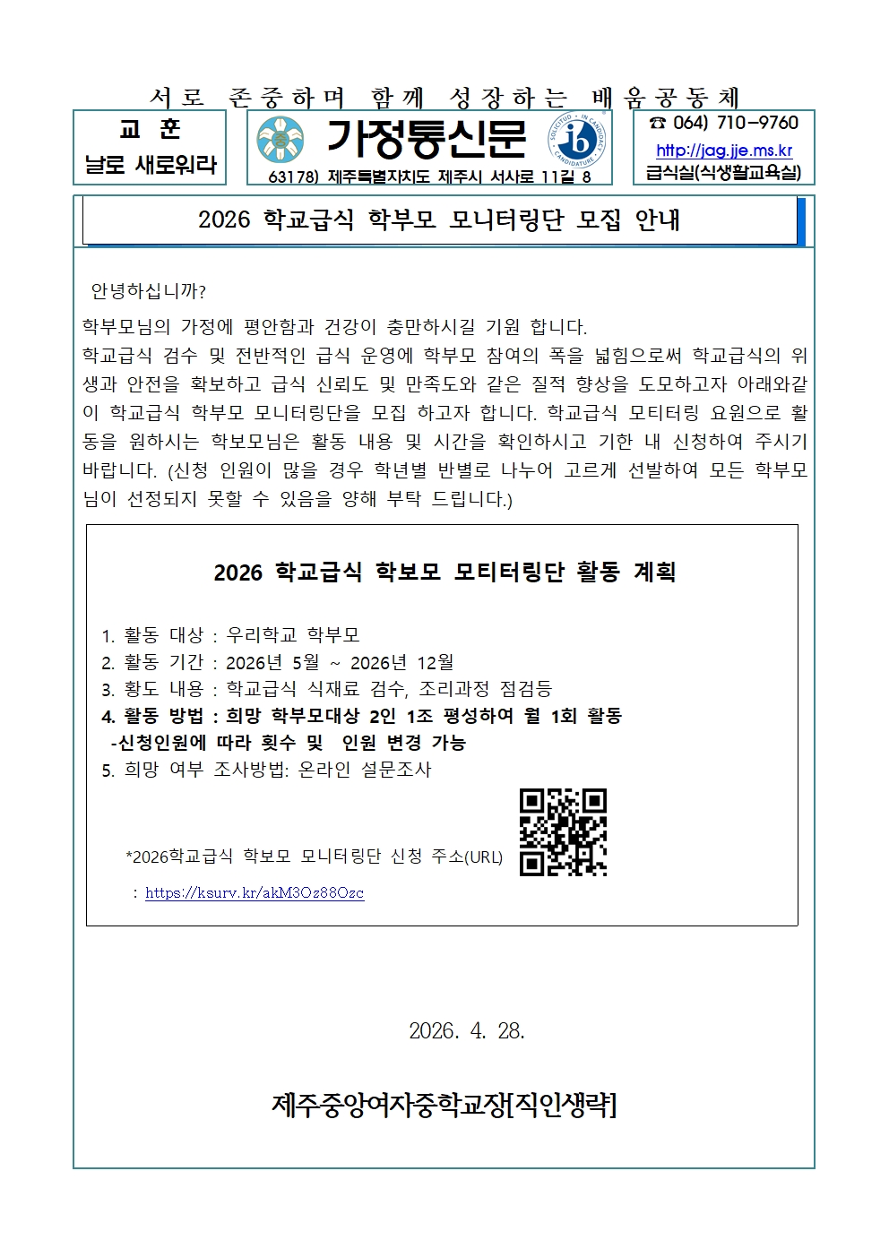 2026 학교급식 학부모 모니터링단 모집안내