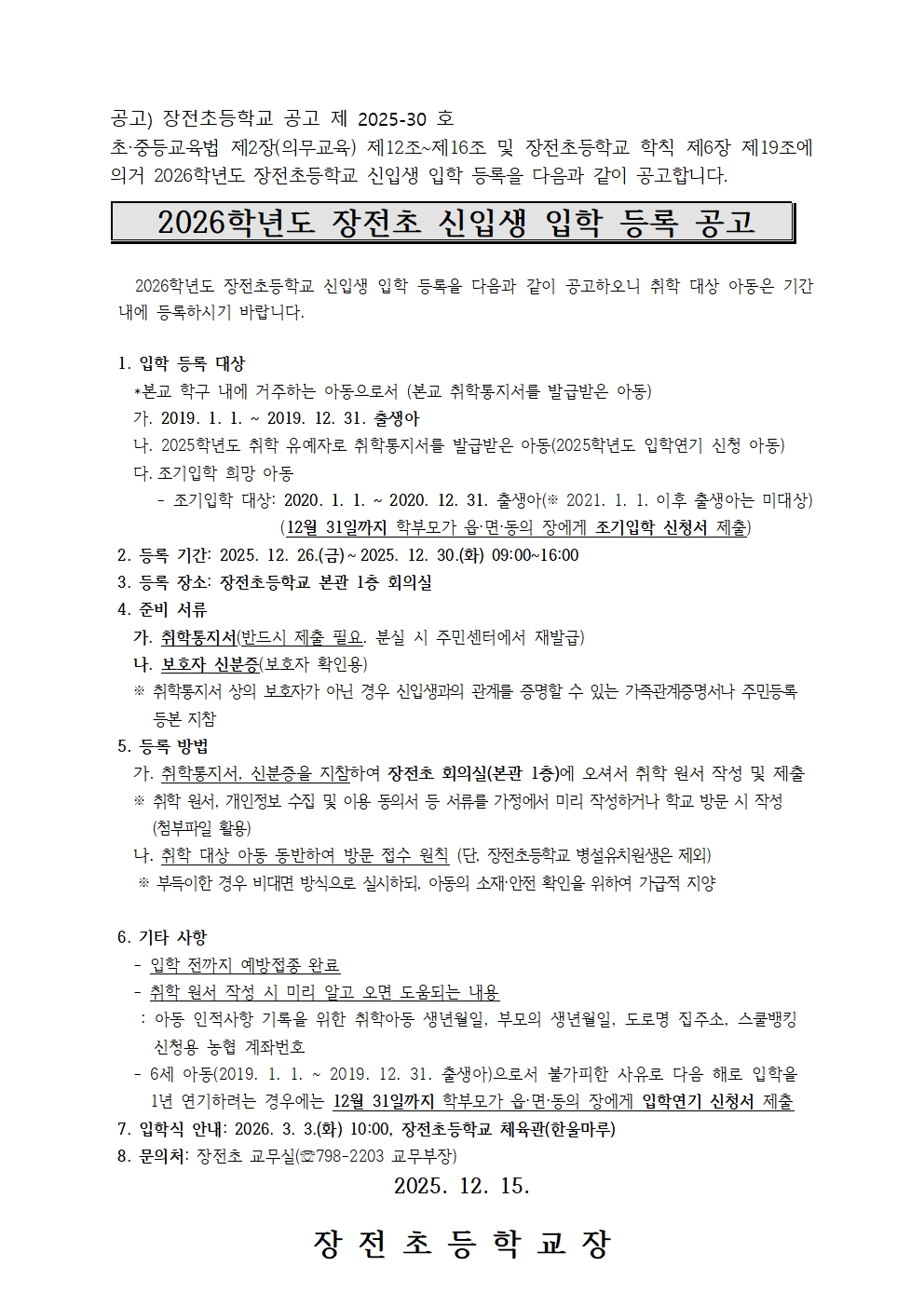 2026학년도 장전초 신입생 입학 등록 공고