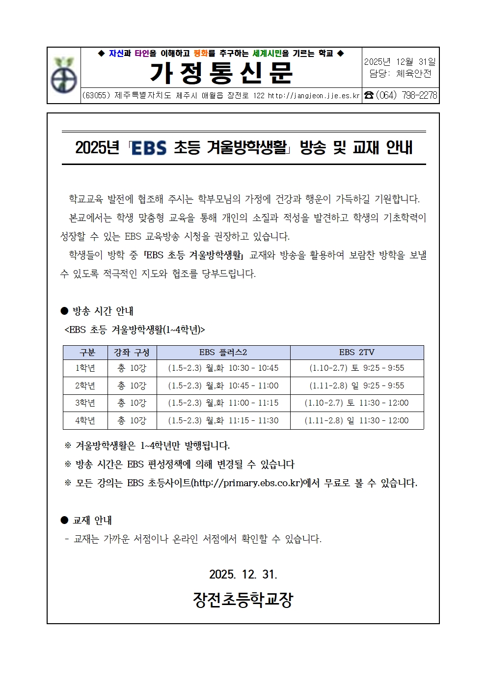 2025년 EBS 초등 겨울방학생활 방송 및 교재 안내
