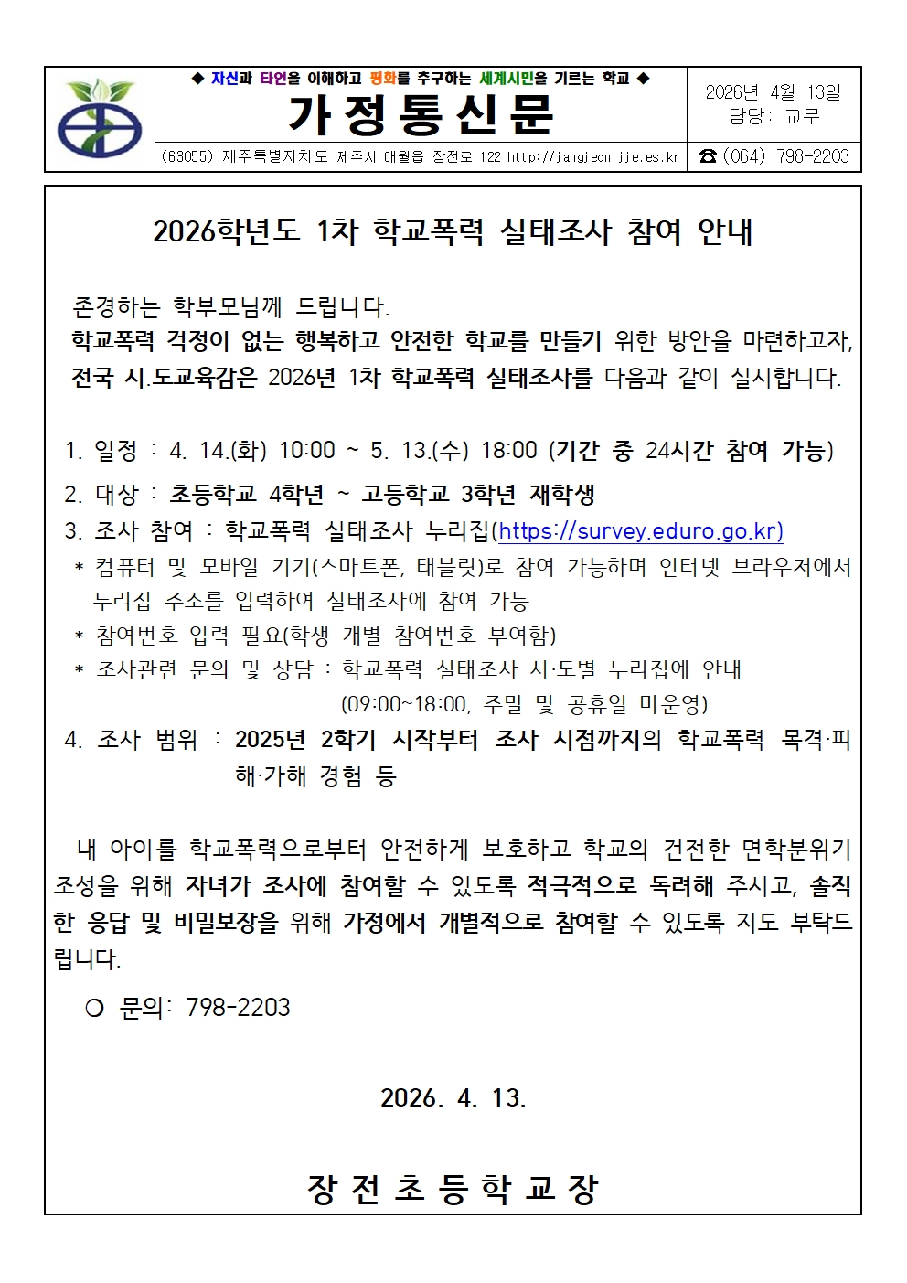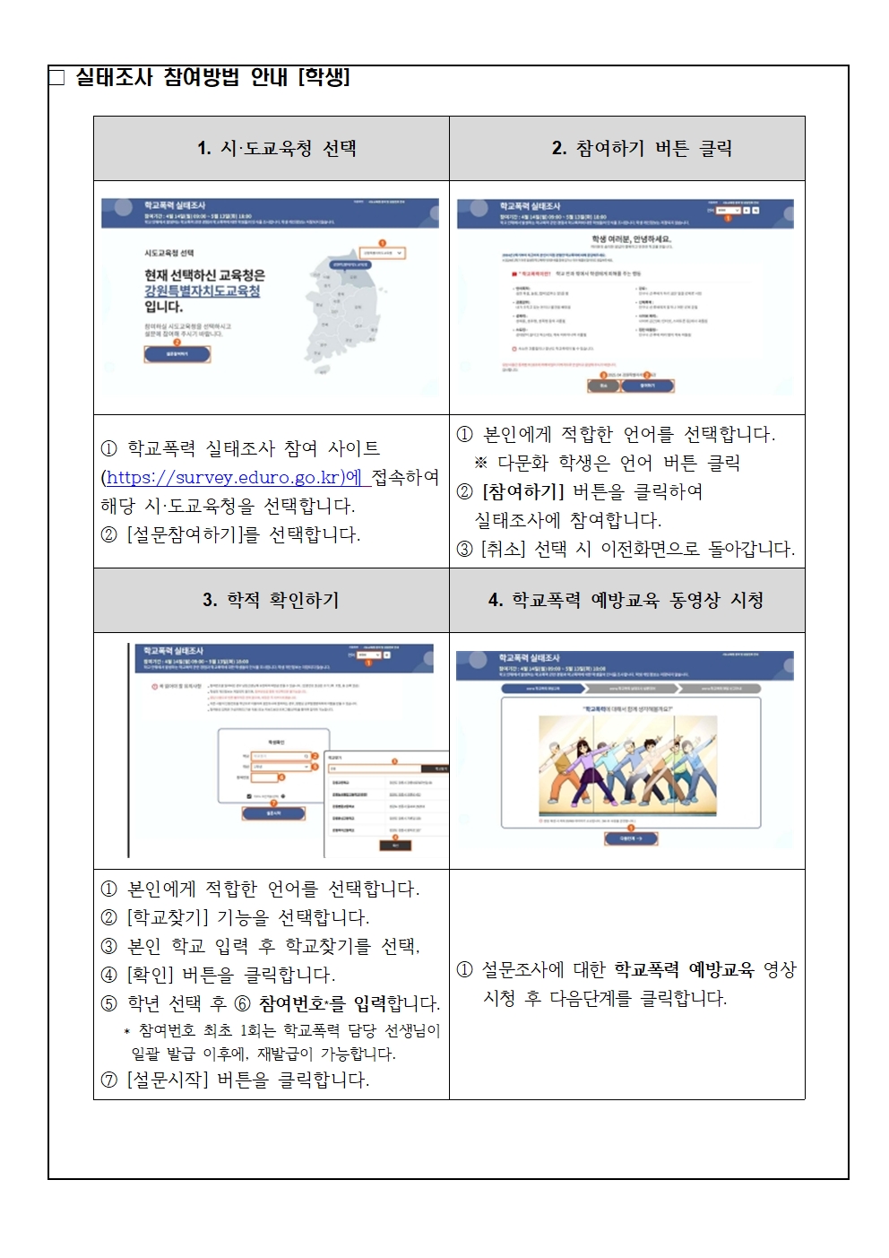 2026학년도 1차 학교폭력 실태조사 참여 안내