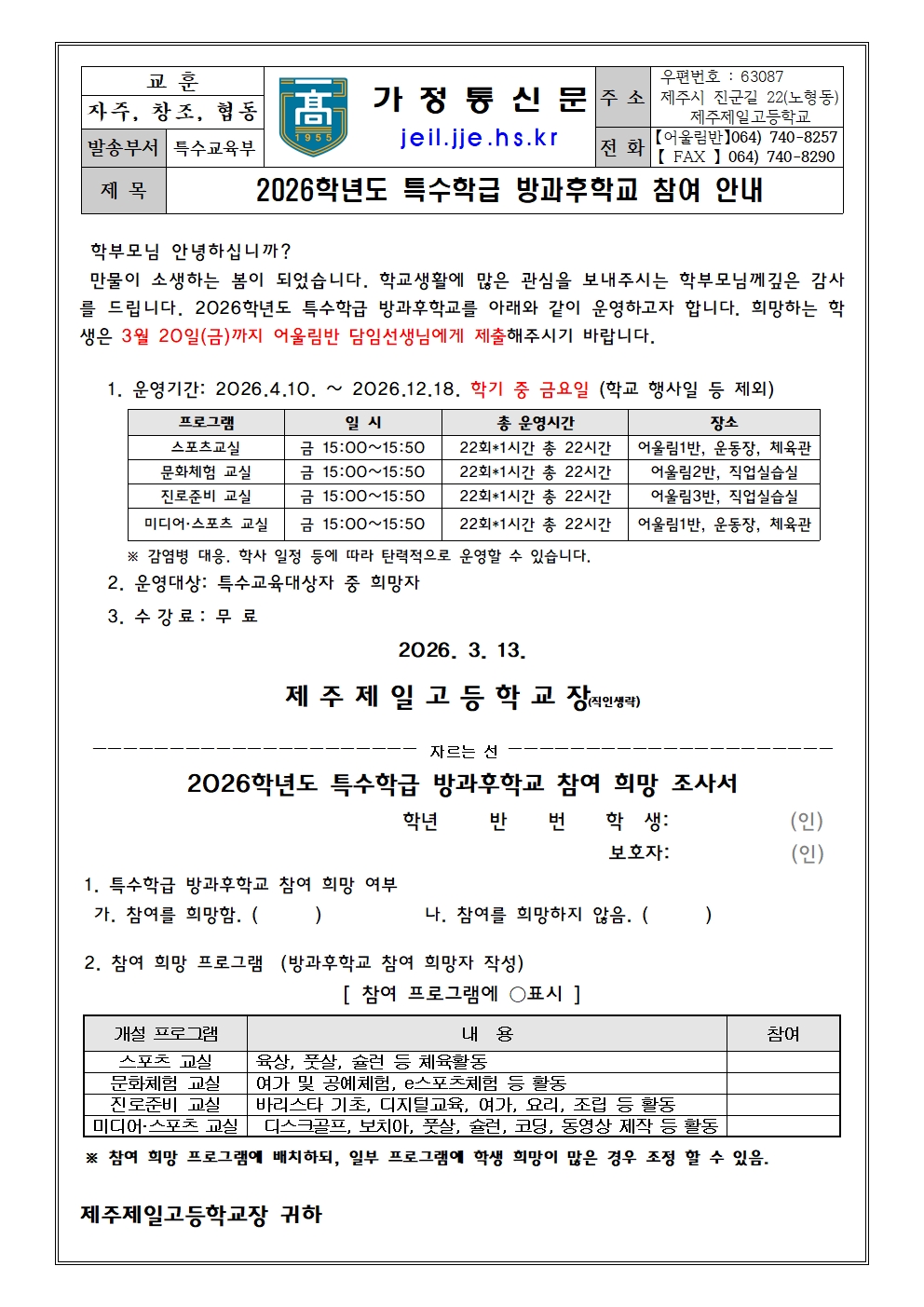 2026학년도 특수학급 방과후학교 참여 안내