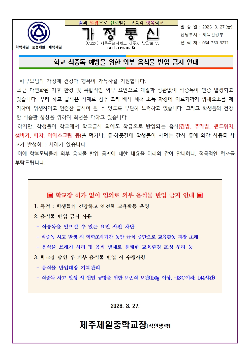 2026학년도 학교 식중독 예방을 위한 외부 음식물 반입 금지 안내