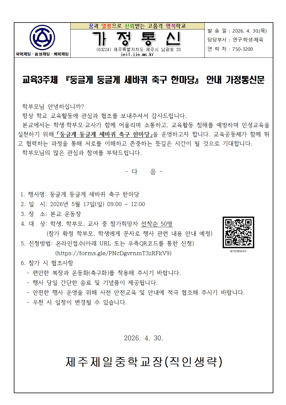 교육3주체 '둥글게 둥글게 세바퀴 축구 한마당' 안내 가정통신문