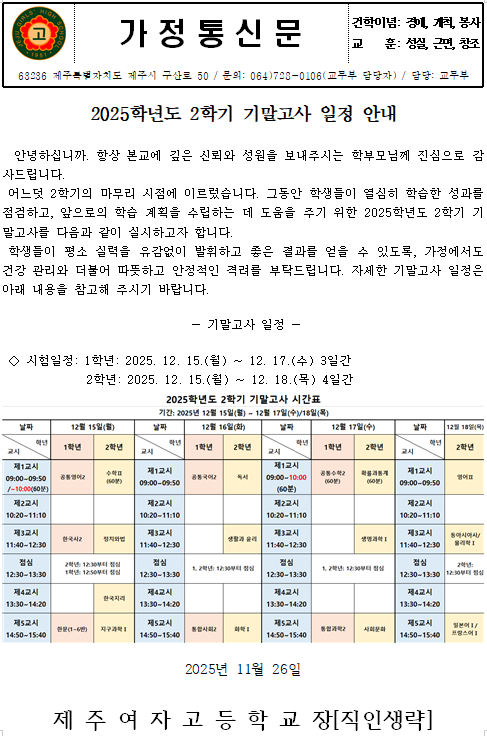 2025학년도 2학기 기말고사 시간표를 안내합니다.