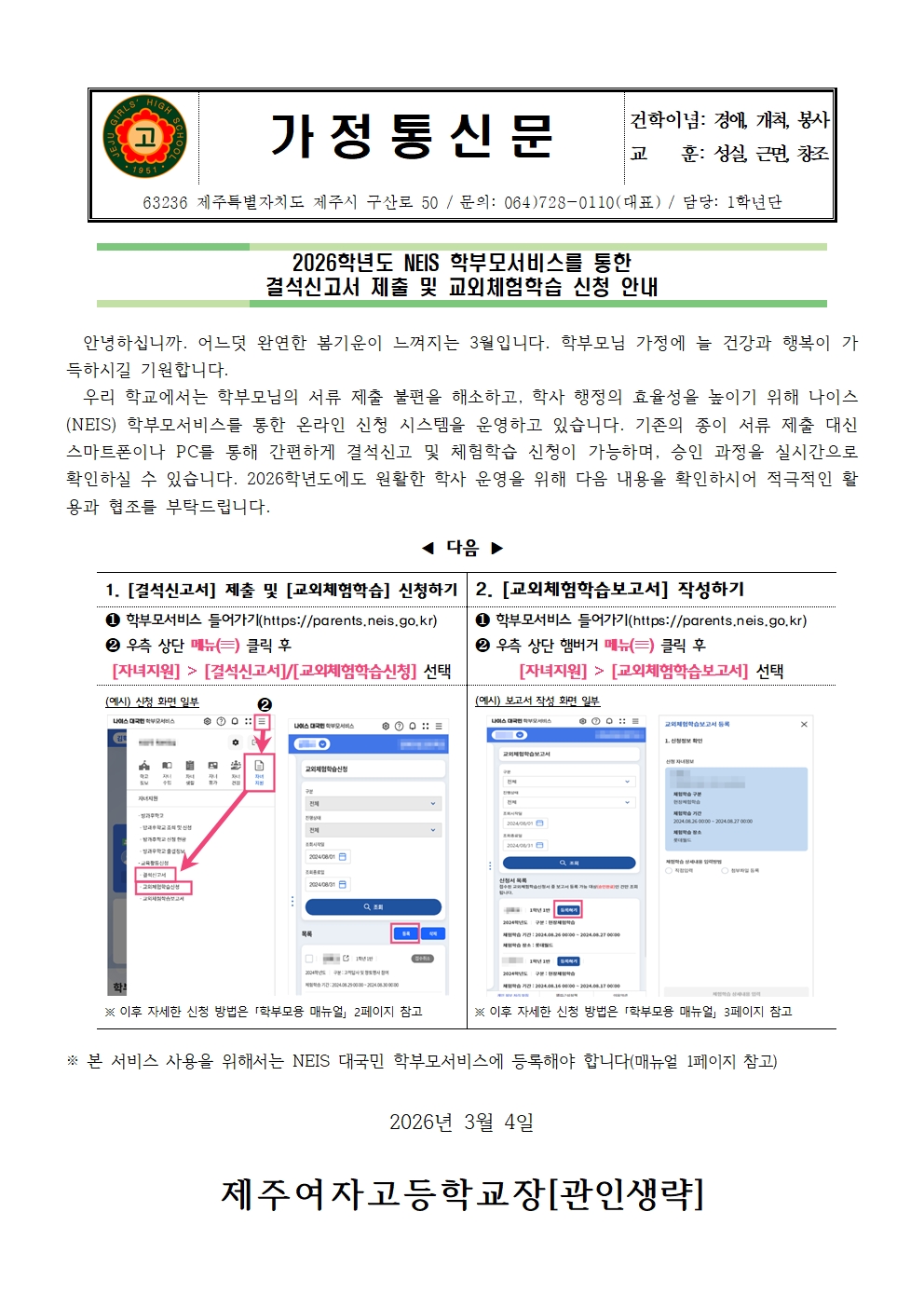 2026학년도 NEIS 학부모서비스를 통한 결석신고서 제출 및 교외체험학습 신청 안내