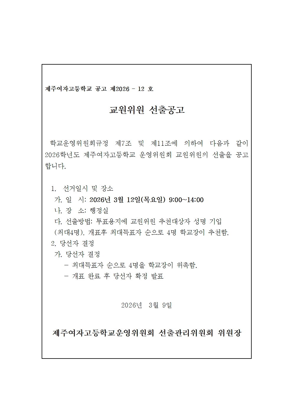 [안내] 2026학년도 학교운영위원회 교원위원 선출 공고