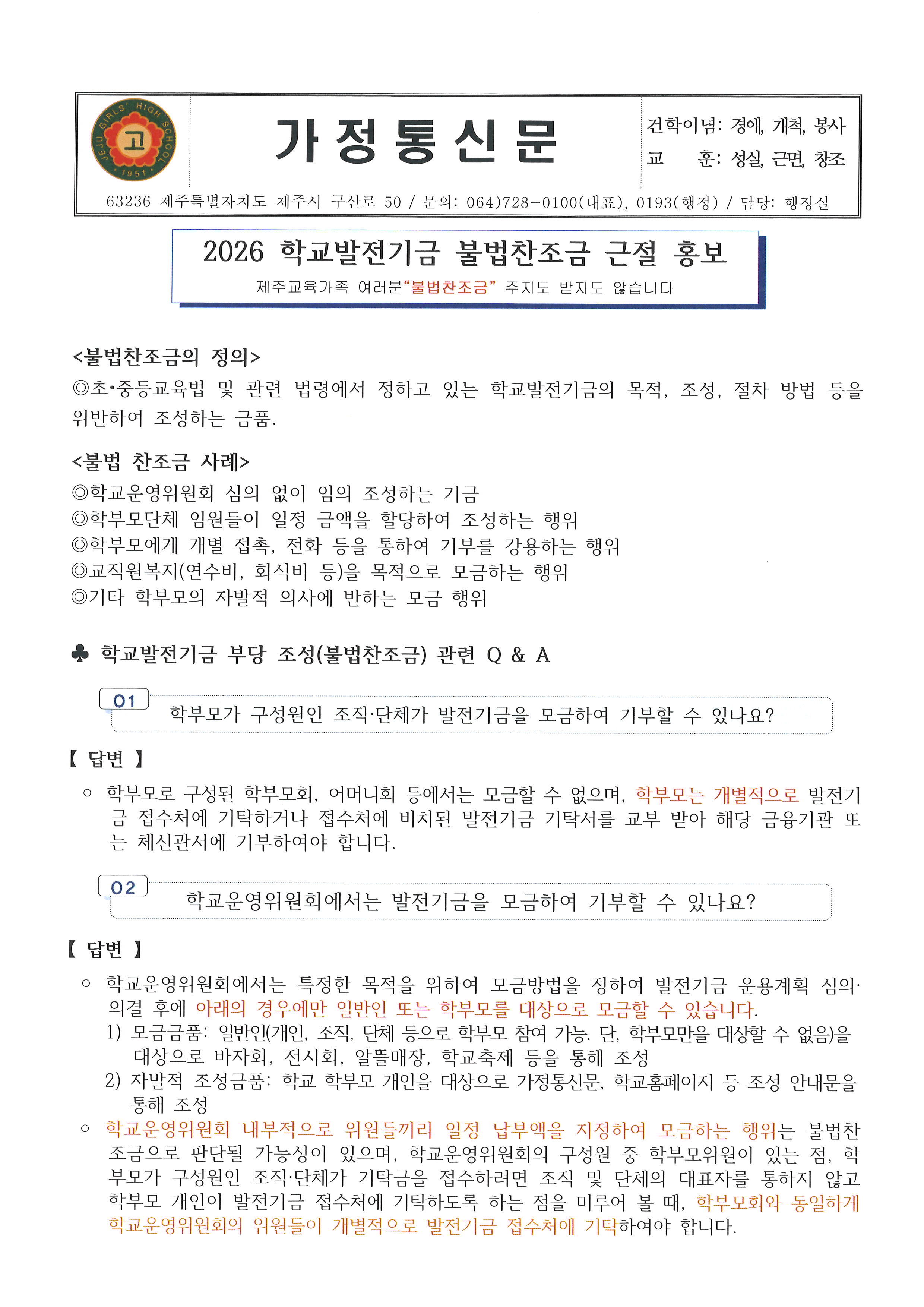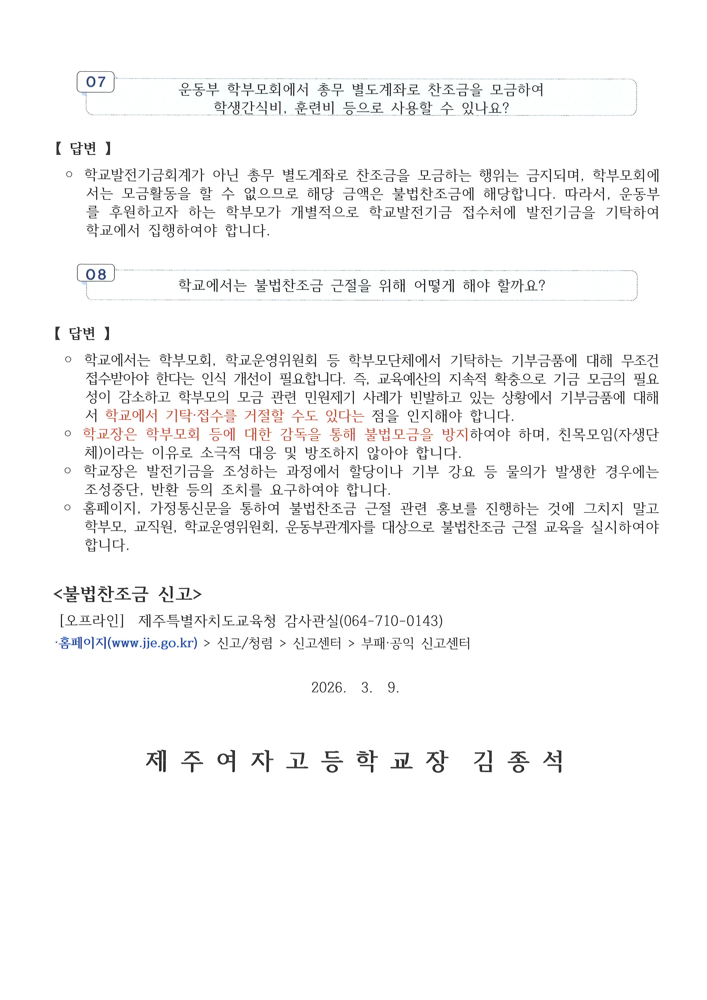 2026학년도 학교발전기금 불법찬조금 근절 홍보