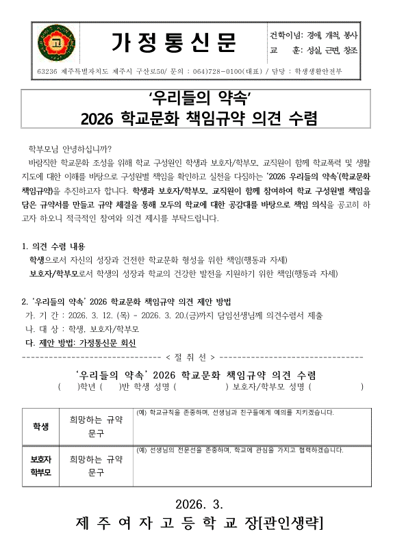 2026 우리들의 약속(학교문화 책임규약) 의견 수렴 가정통신문