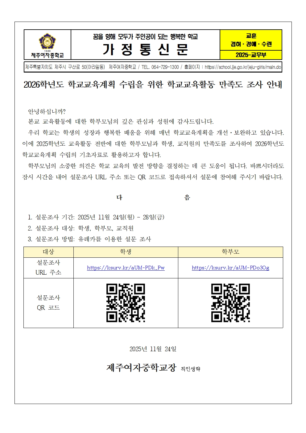 2026학년도 학교교육계획 수립을 위한 학교교육활동 만족도 조사 안내 가정통신문