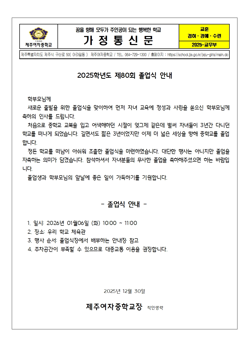 [제주시교육지원청 가정통신문] 2026~2027학년도 제주시교육지원청 학교폭력대책심의위원회 학부모 위원 모집 안내