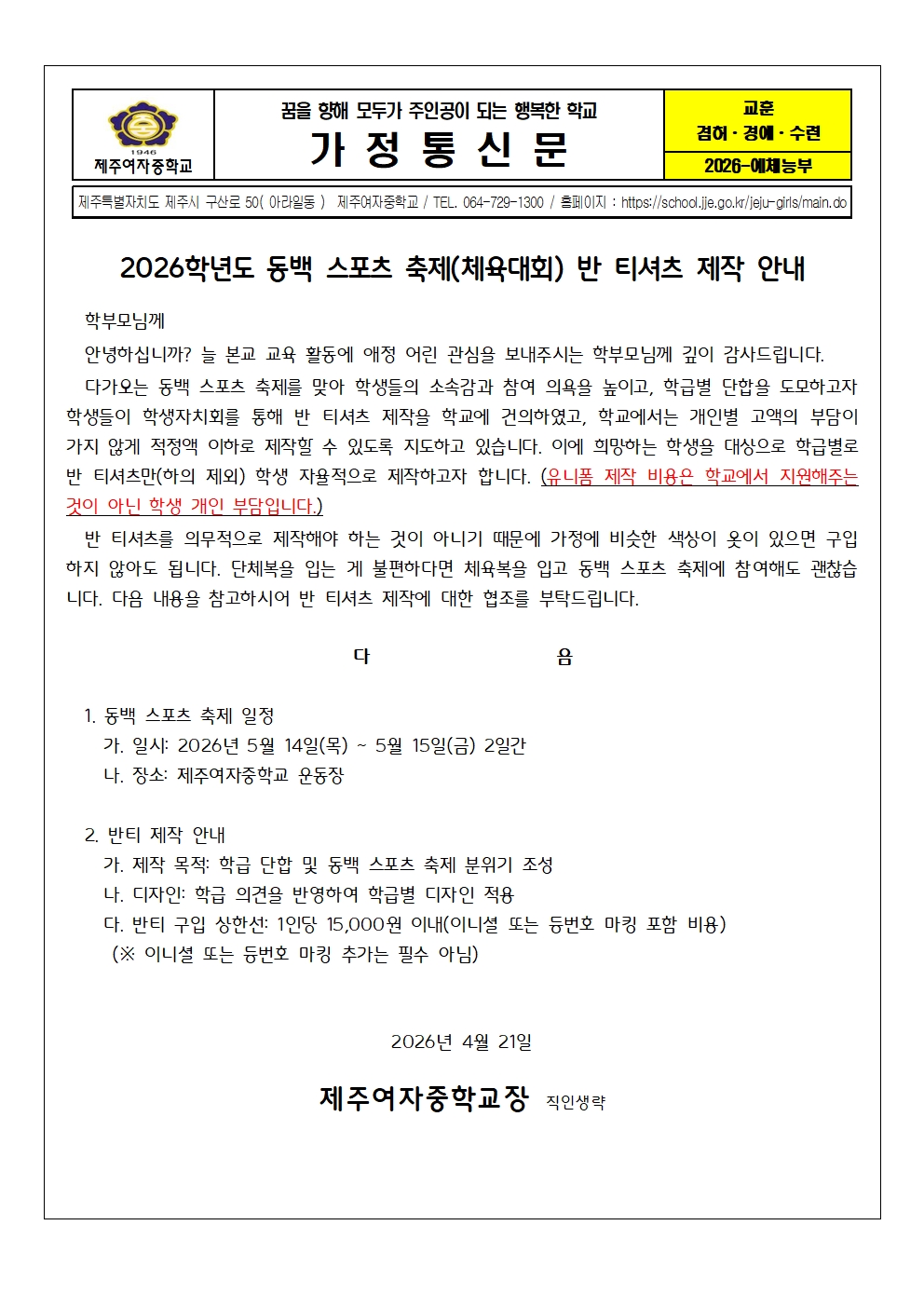 2026학년도 동백 스포츠 축제 반 티셔츠 제작 안내