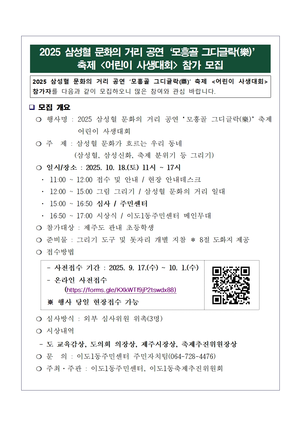 이도 1동에서는 탐라개국 신화의 역사적 정체성을 널리 알리고자 삼성혈 문화의거리 공연 '제11회 모흥골 그디글락(樂)' 축제 어린이 사생대회를 아래와 같이 개최하니 관심있는 어린이들이 참여바랍니다.