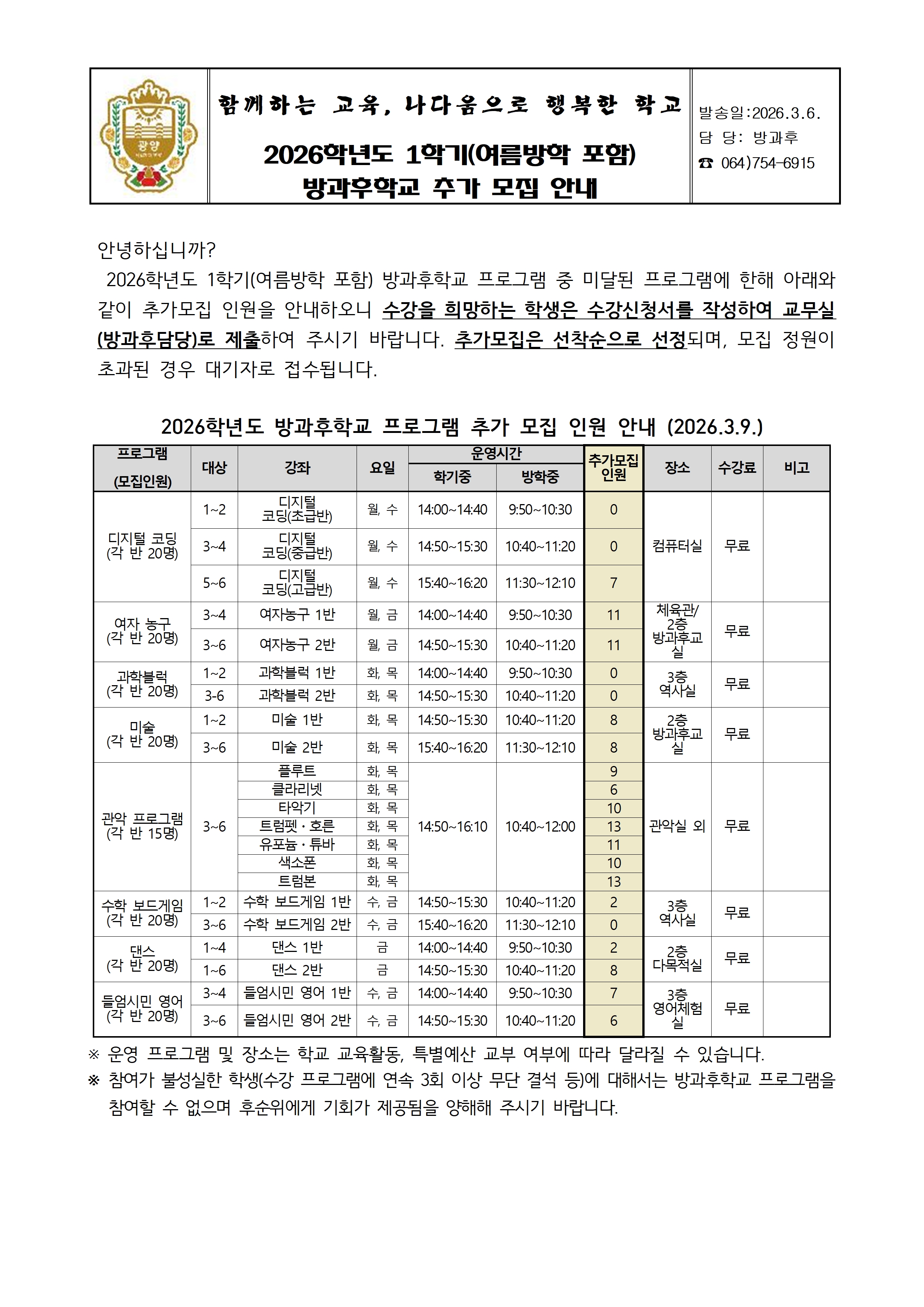 2026학년도 1학기(여름방학 포함) 방과후학교 추가 모집 안내
