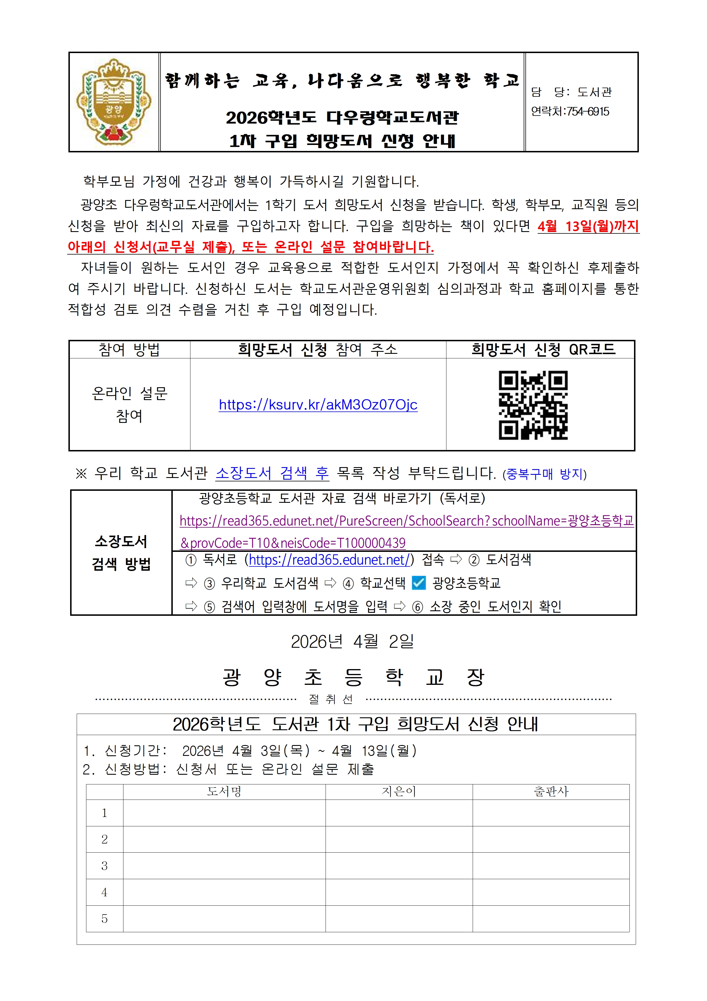 2026학년도 다우렁학교도서관 1차 구입 희망도서 신청 안내