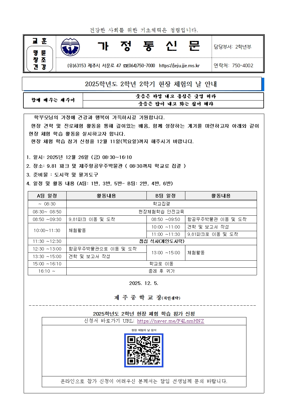 2025학년도 2학년 2학기 현장 체험의 날 안내