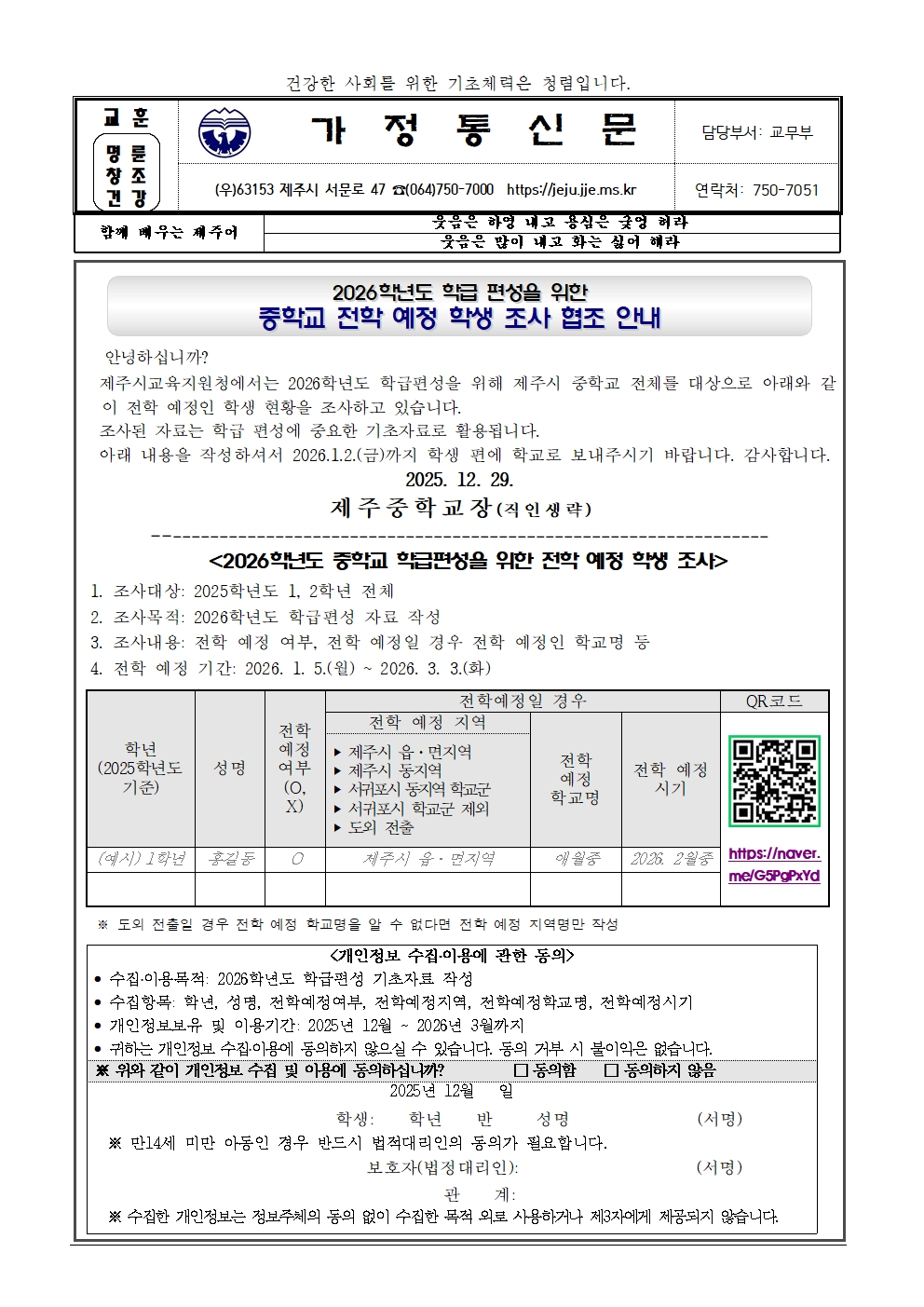 2026학년도 중학교 전학 예정 학생 조사 협조 안내
