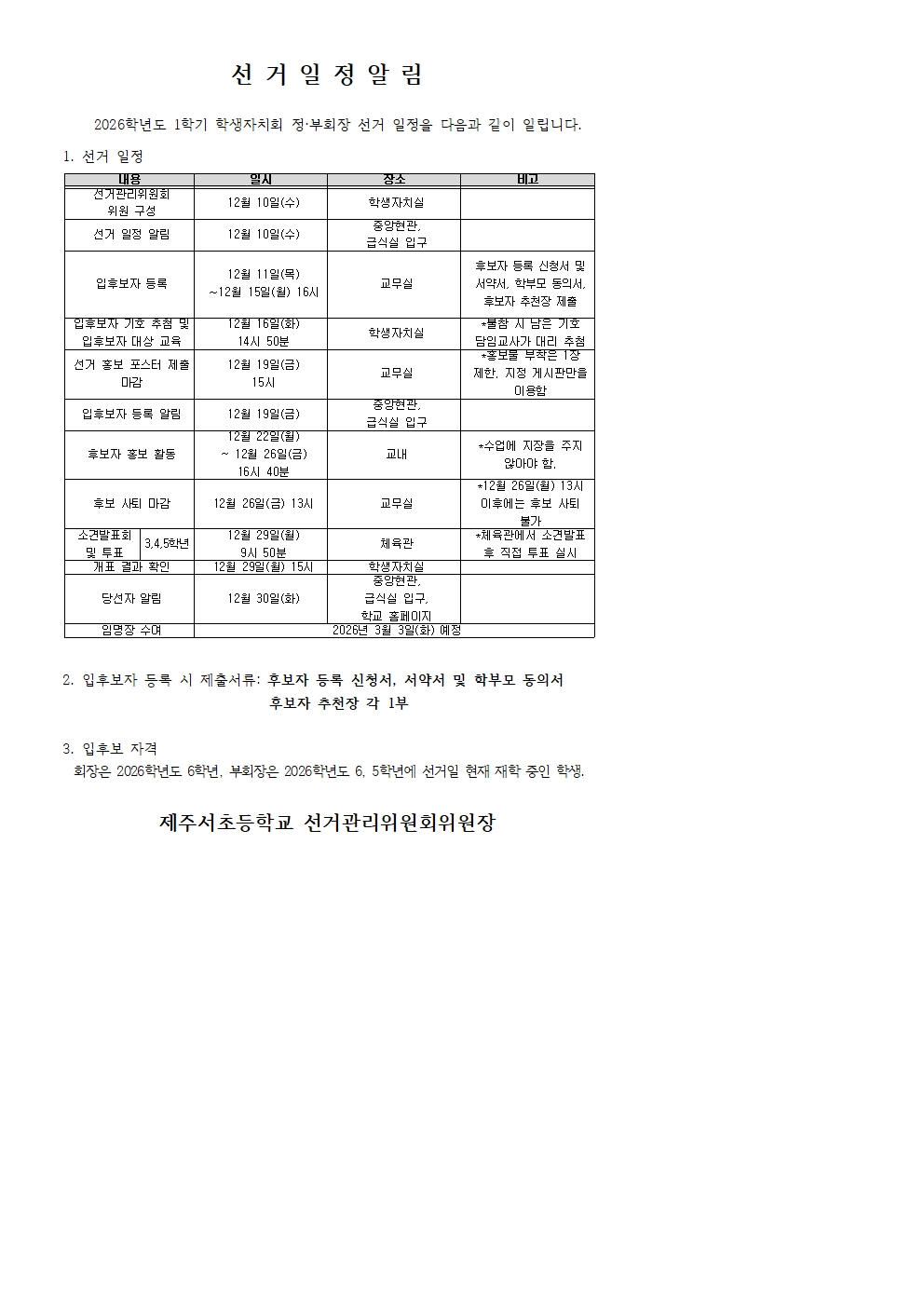 2026학년도 1기 학생자치회 정·부회장 선거 일정 알림