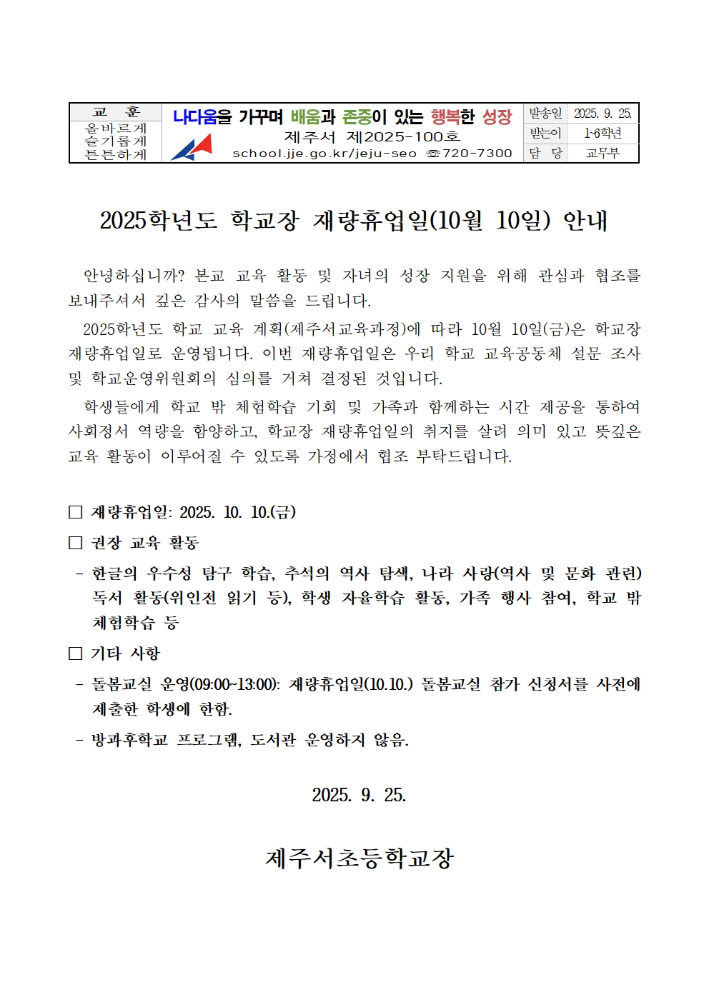 2025학년도 학교장 재량휴업일(10월 10일) 안내
