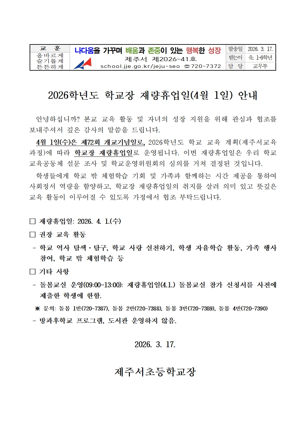 (2026-41호) 2026학년도 학교장 재량휴업일(4월 1일) 안내.hwp
