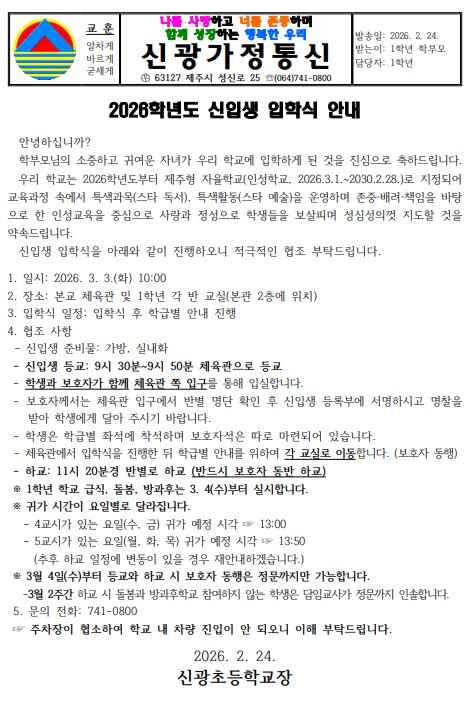 [제주특별자치도교육청 가정통신문] 건강한 학교생활을 위한 2026년 초,중학교 입학생 예방접종 확인 안내
