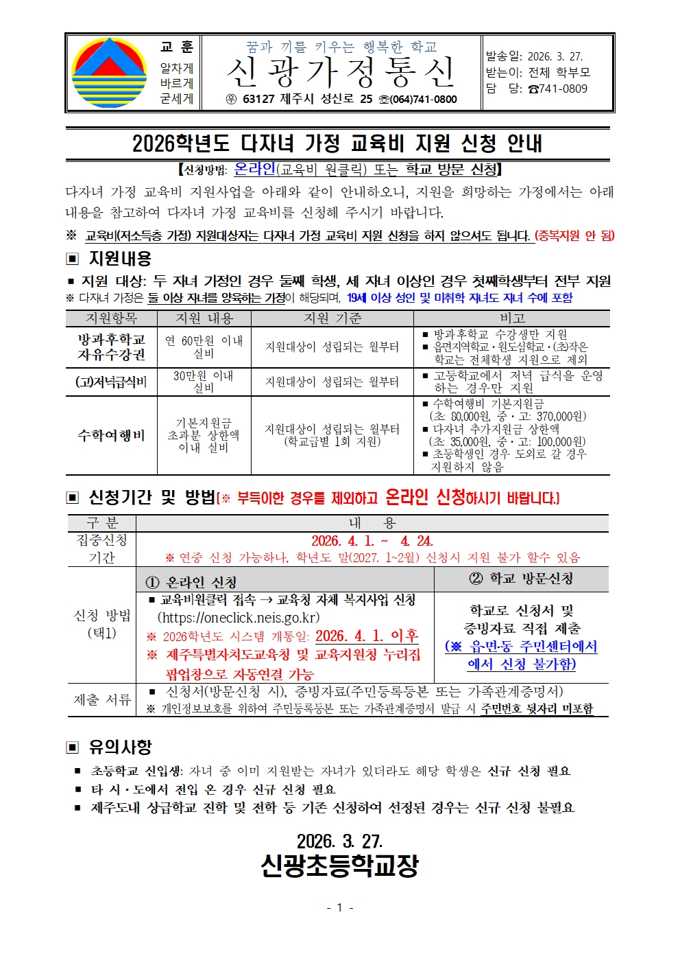 2026학년도 다자녀 가정 교육비 지원 신청 안내
