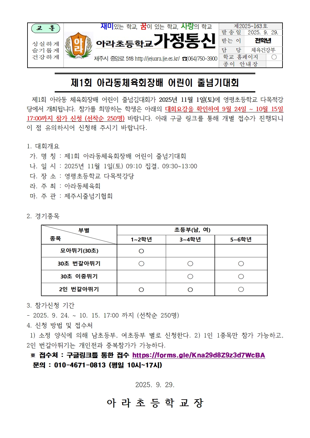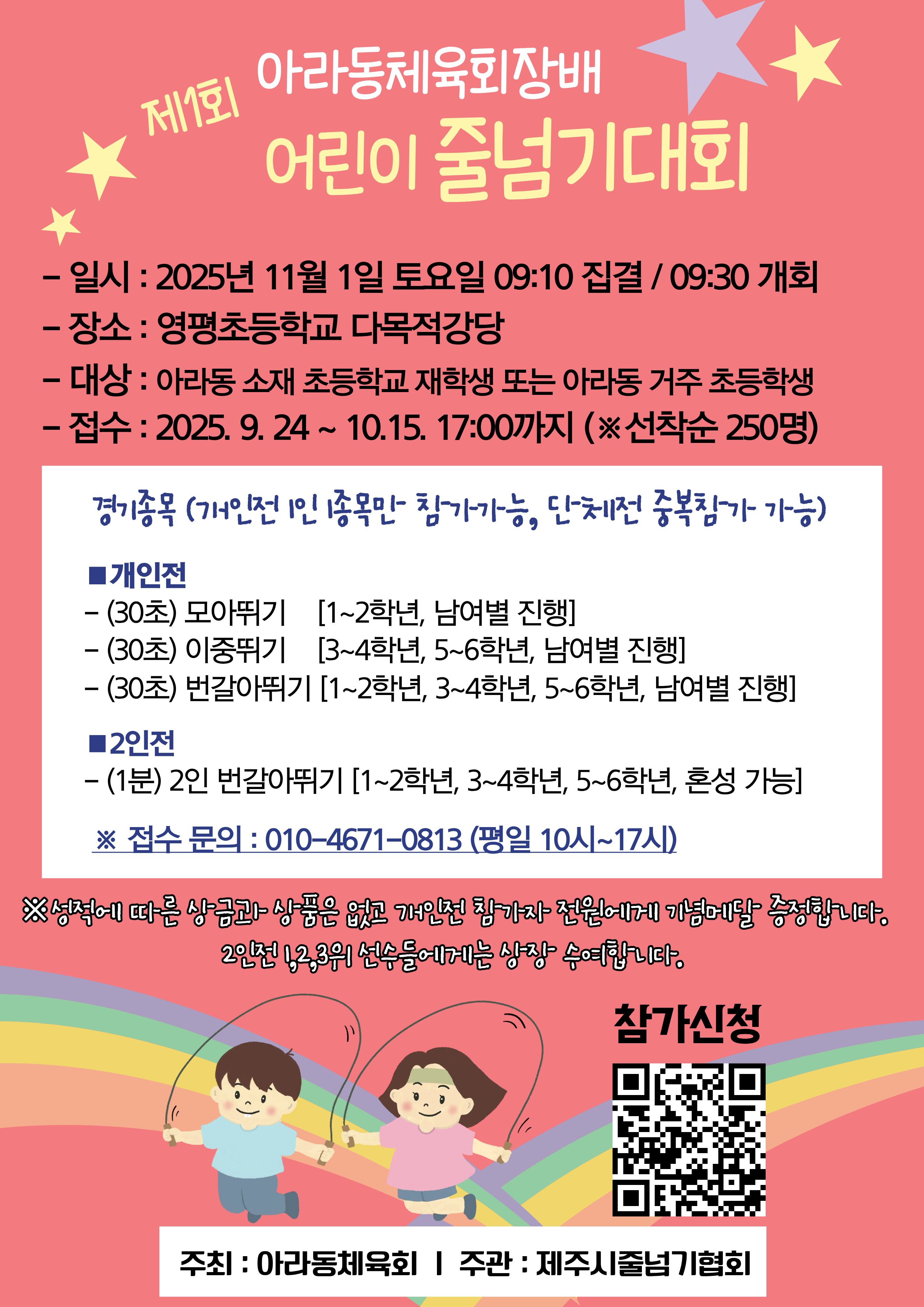 제1회 아라동 체육회장배 어린이 줄넘김대회가 2025년 11월 1일(토)에 영평초등학교 다목적강당에서 개최됩니다.