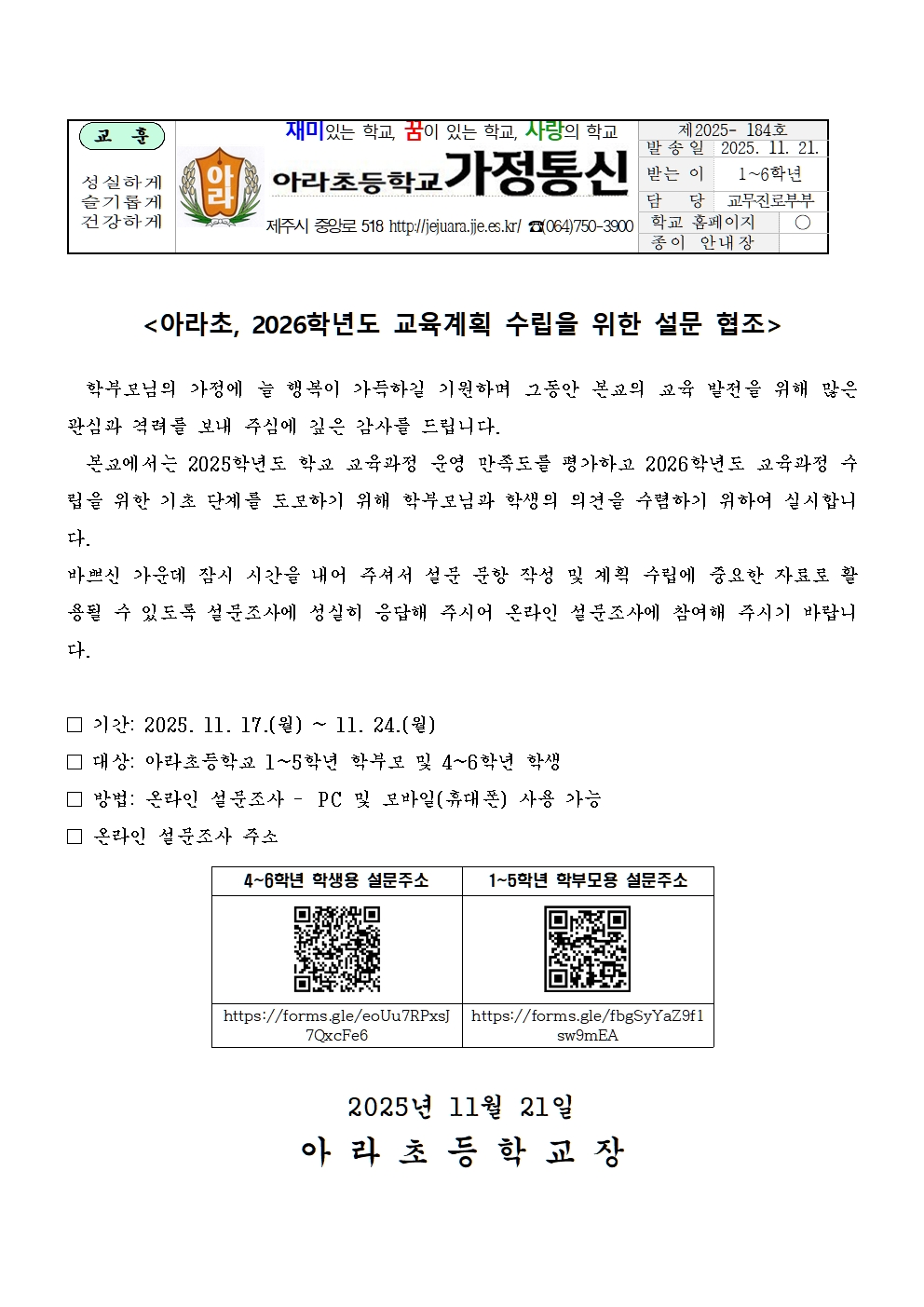 1~5학년 학부모용 설문주소: https://forms.gle/fbgSyYaZ9f1sw9mEA