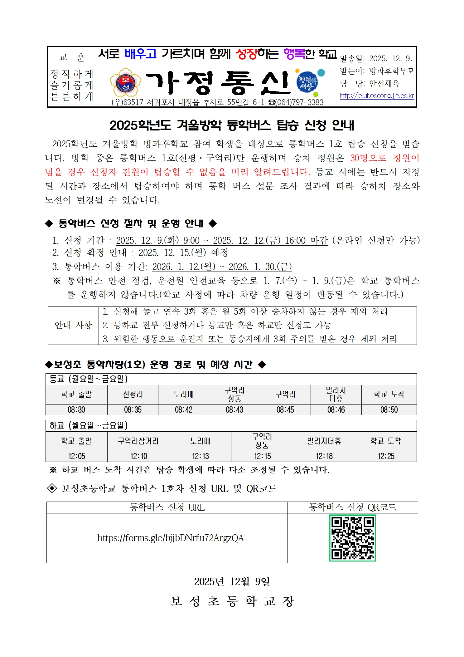 2025학년도 겨울방학 통학버스 탑승 신청 안내