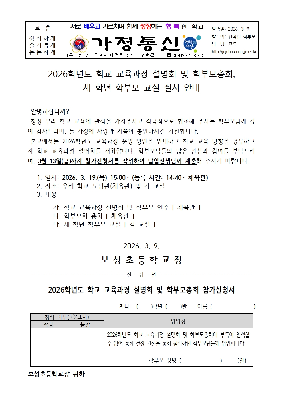 2026학년도 학교 교육과정 설명회 및 학부모총회 개최 안내