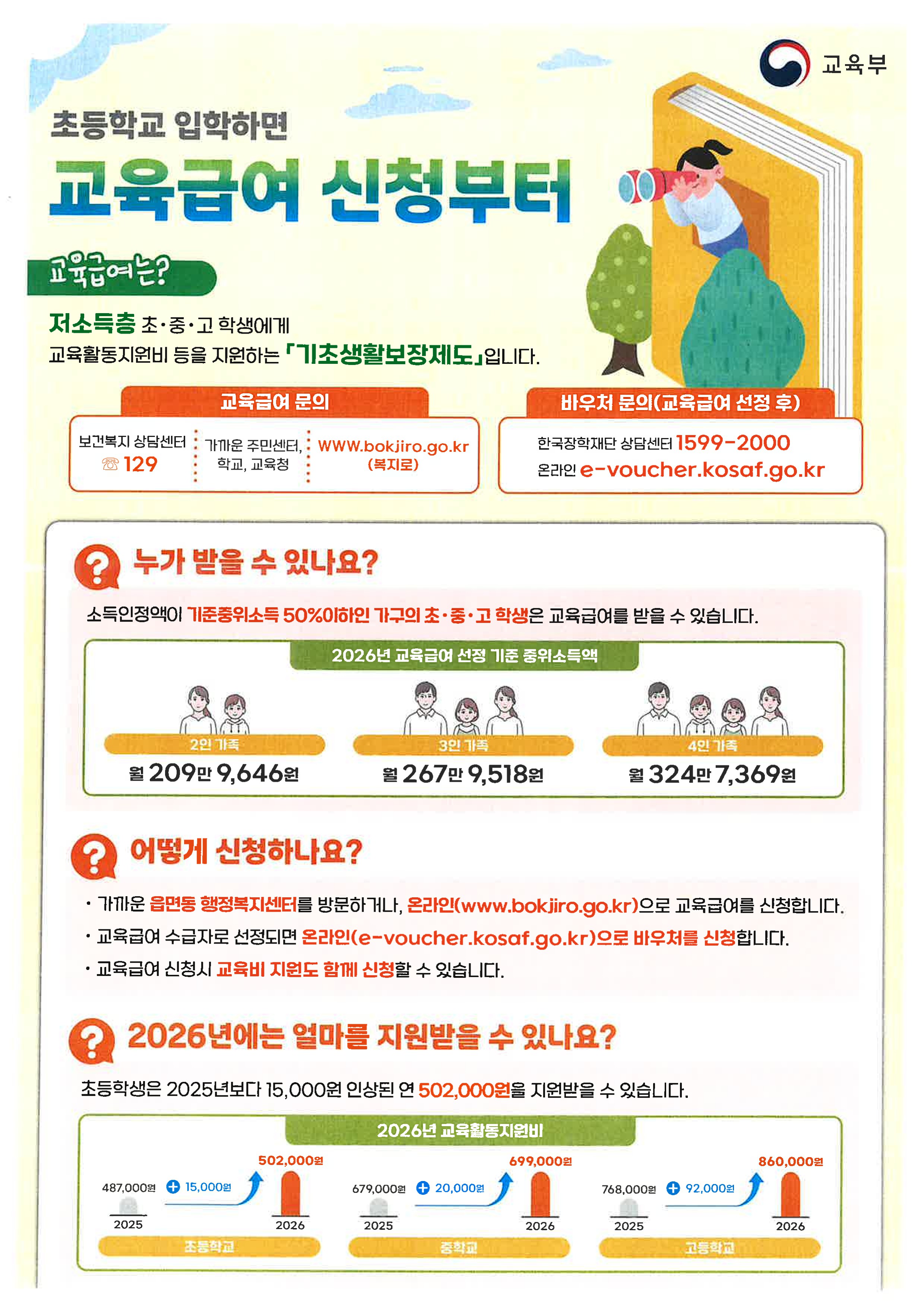 저소득층 가정 교육비 부담 경감을 위한 2026학년도 교육급여 및 교육비 지원 사업을 운영 하오니, 지원을 희망하는 가정에서는 아래 내용을 참고하여 읍면동 주민센터를 방문하거나 온라인(www.bokjiro.go.kr)으로 지원 신청바랍니다.