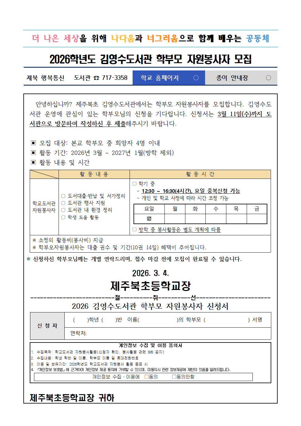 2026학년도 김영수도서관 학부모 자원봉사자 모집 안내
