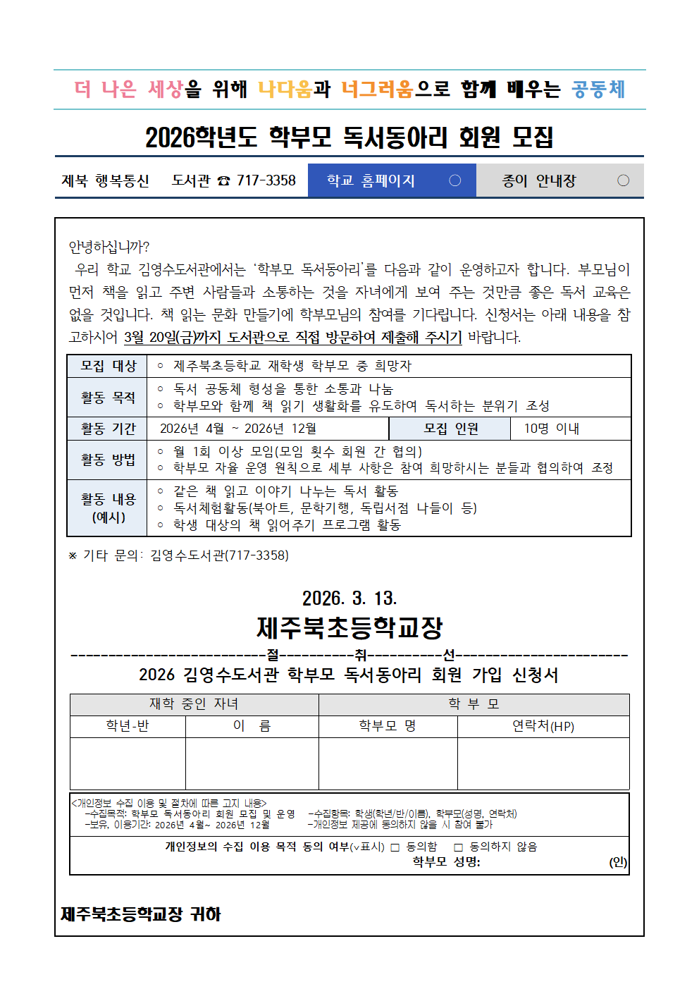** 독서동아리 회원 신청하실 학부모님께서는 도서관으로 방문하셔서 신청서를 작성 후 제출해주시기 바랍니다.