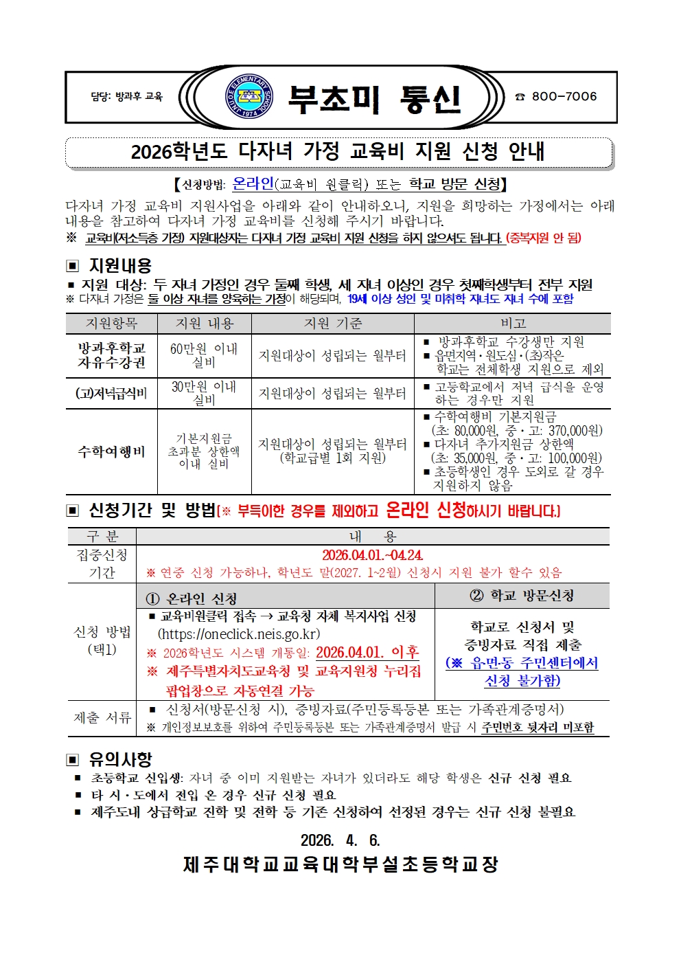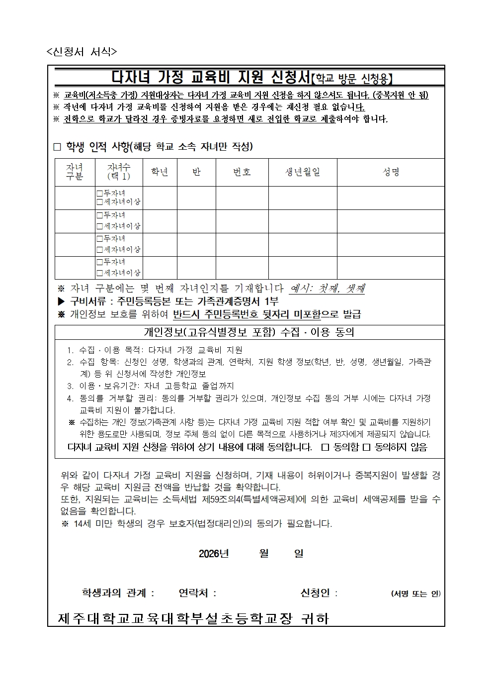 2026학년도 다자녀 가정 교육비 지원 신청 안내