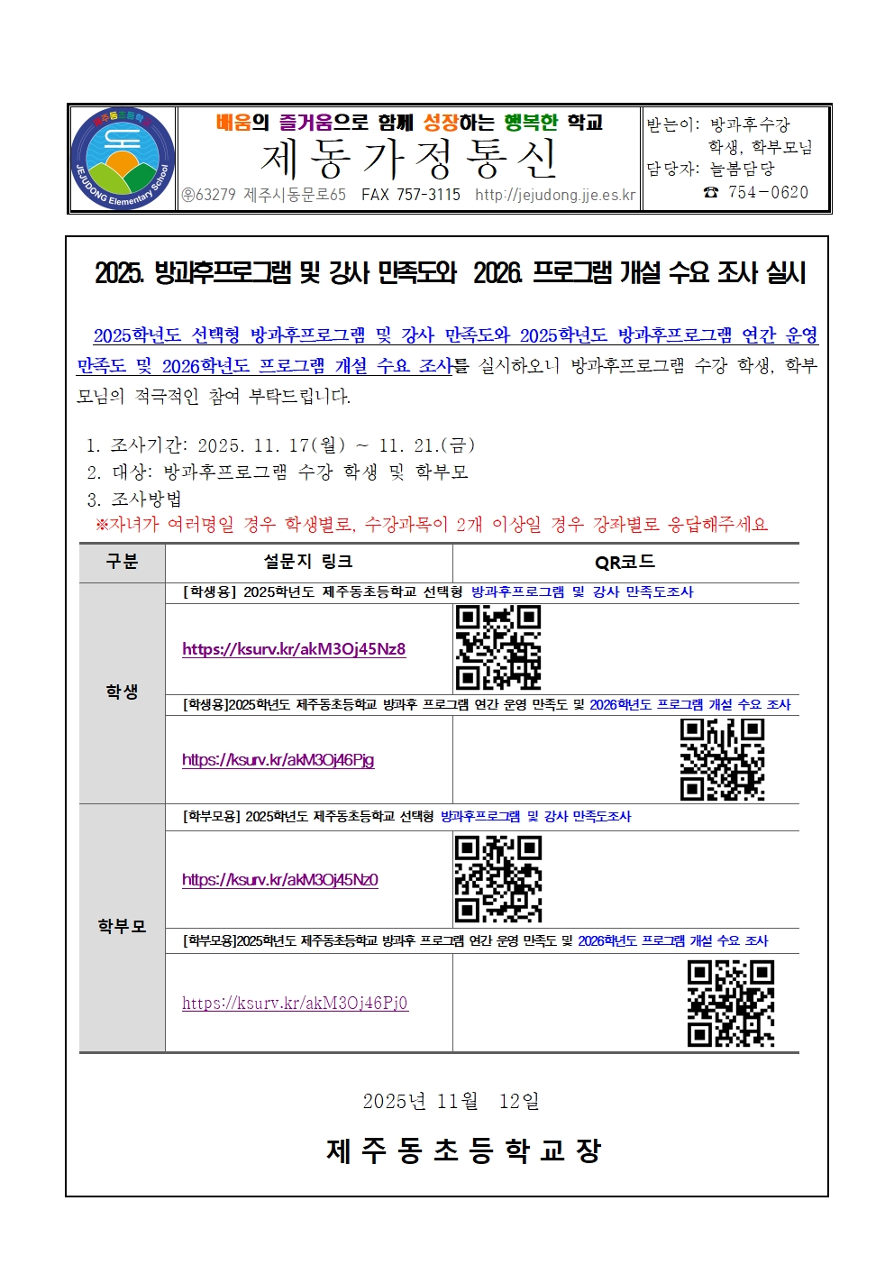 2025. 방과후프로그램 및 강사 만족도와 2026. 프로그램 개설 수요 조사 실시
